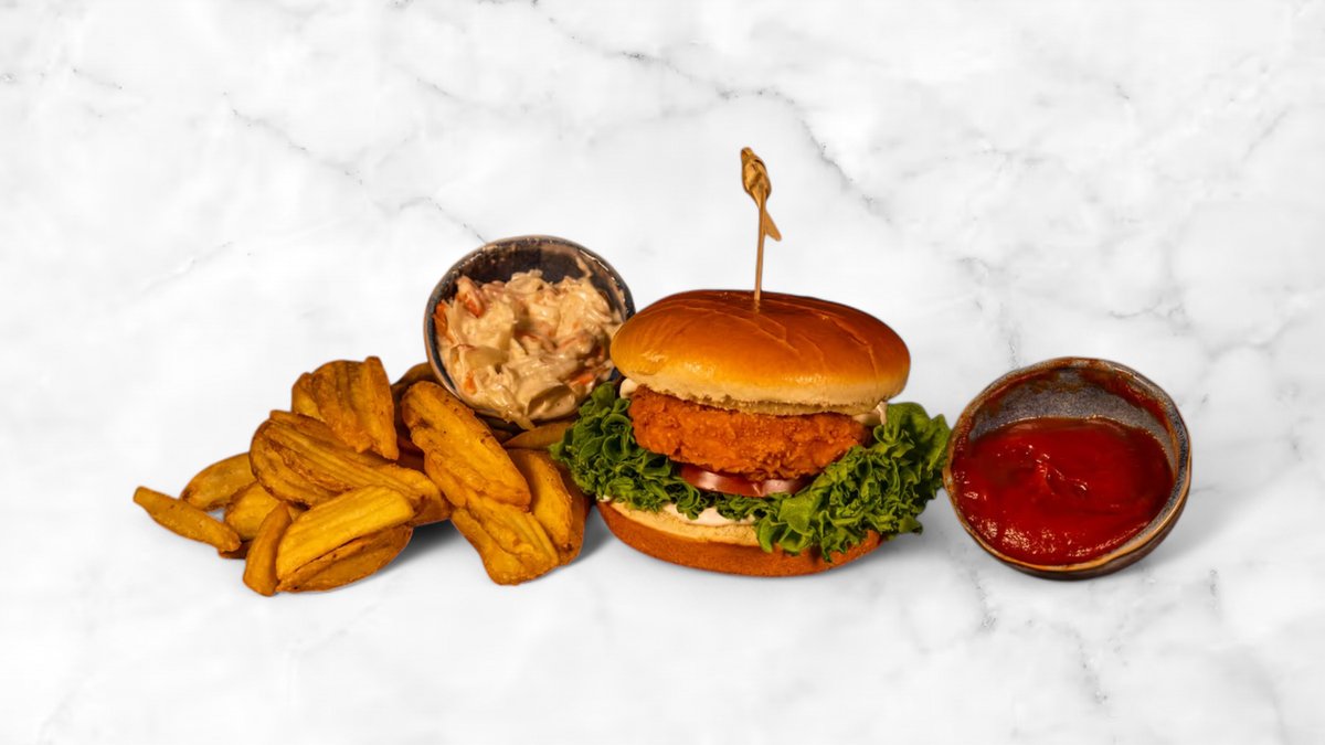 Friterad krispig kycklingburgare med krispig sallad, tomat, vitlöksdressing, krispig pommes och coleslaw.