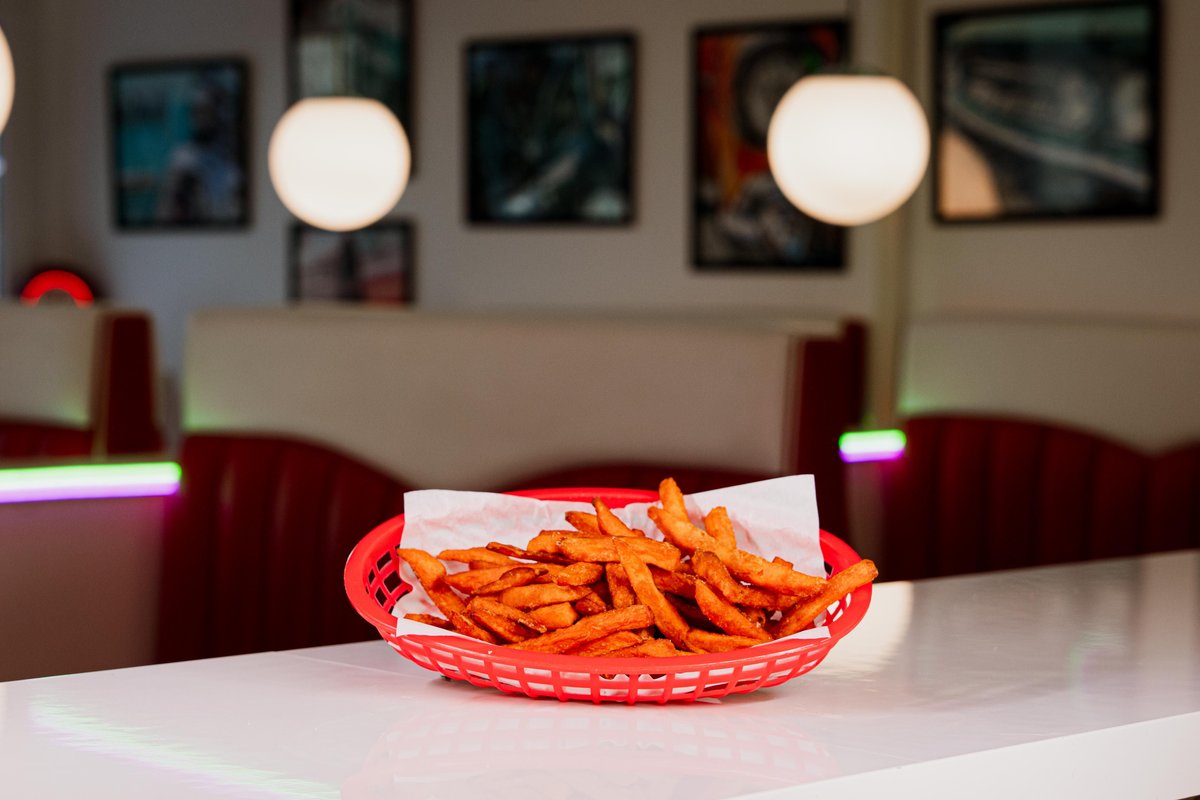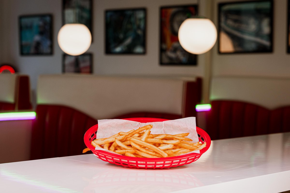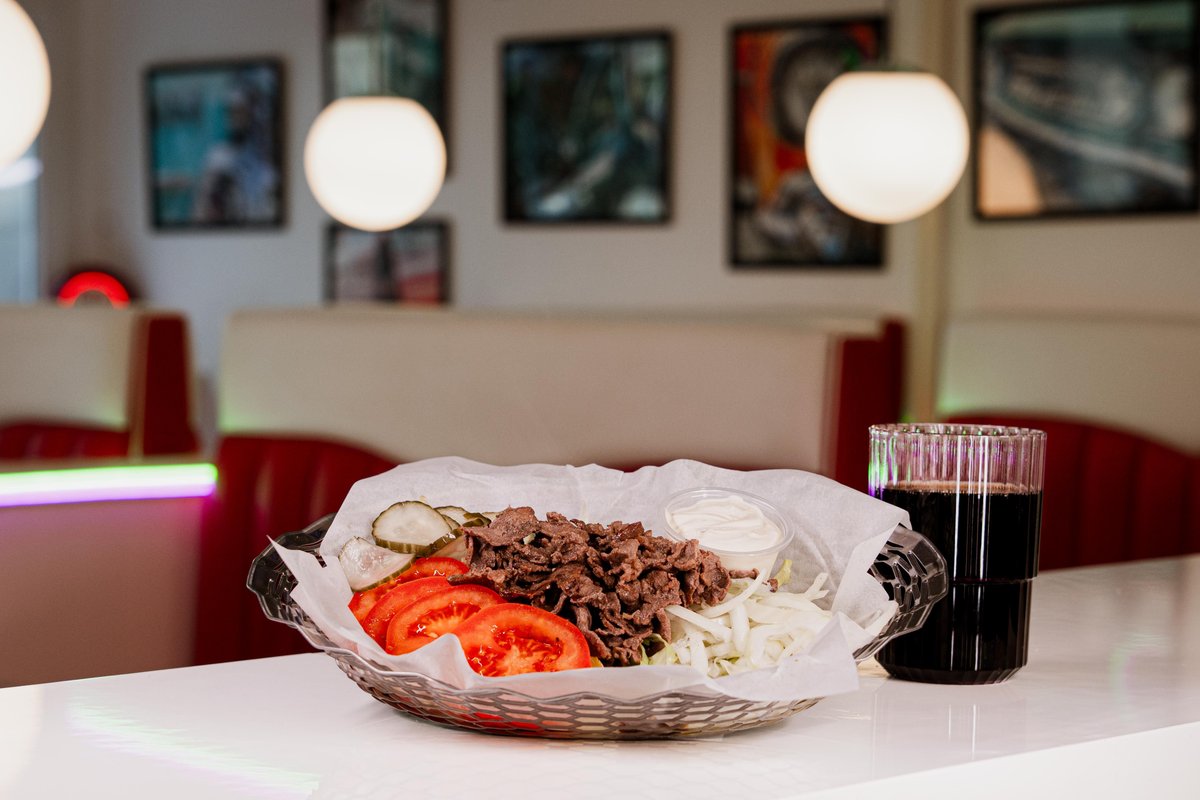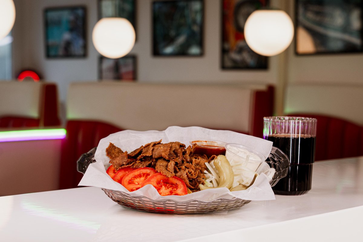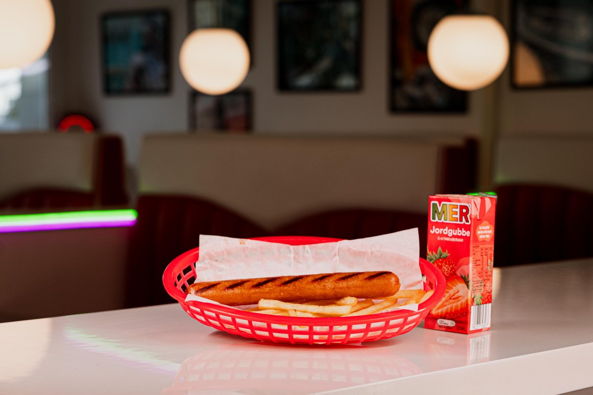 Hamburgare, royal durumbröd, ost, sallad, picklad rödlök, bearnaisesås, sweet & hot tomato, strips och dryck.