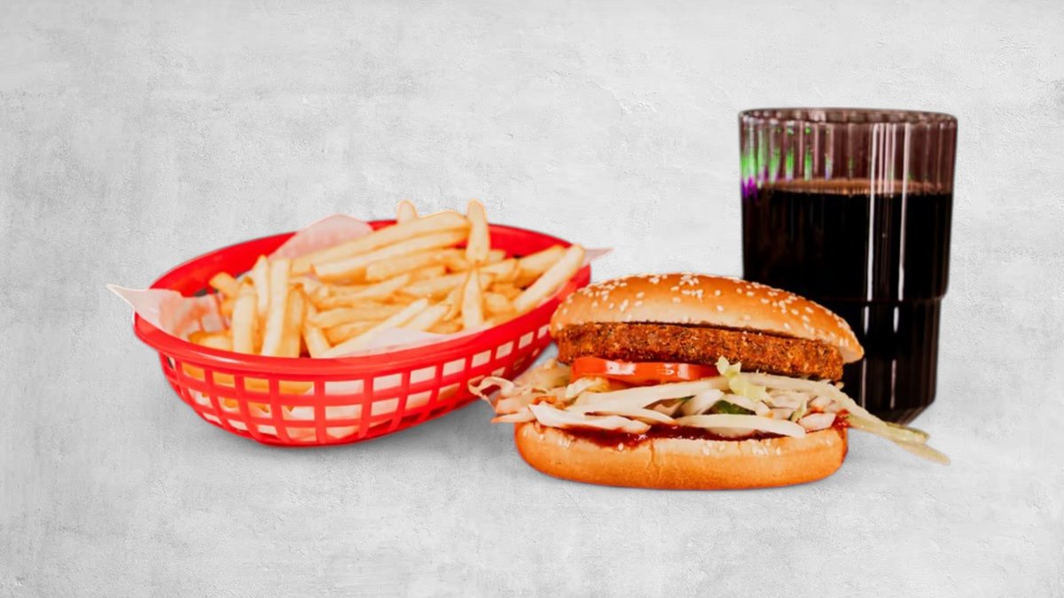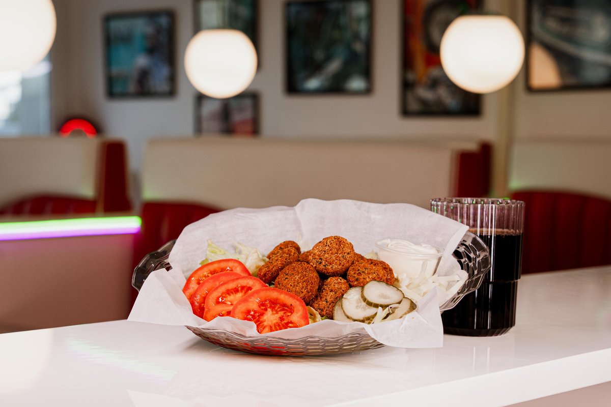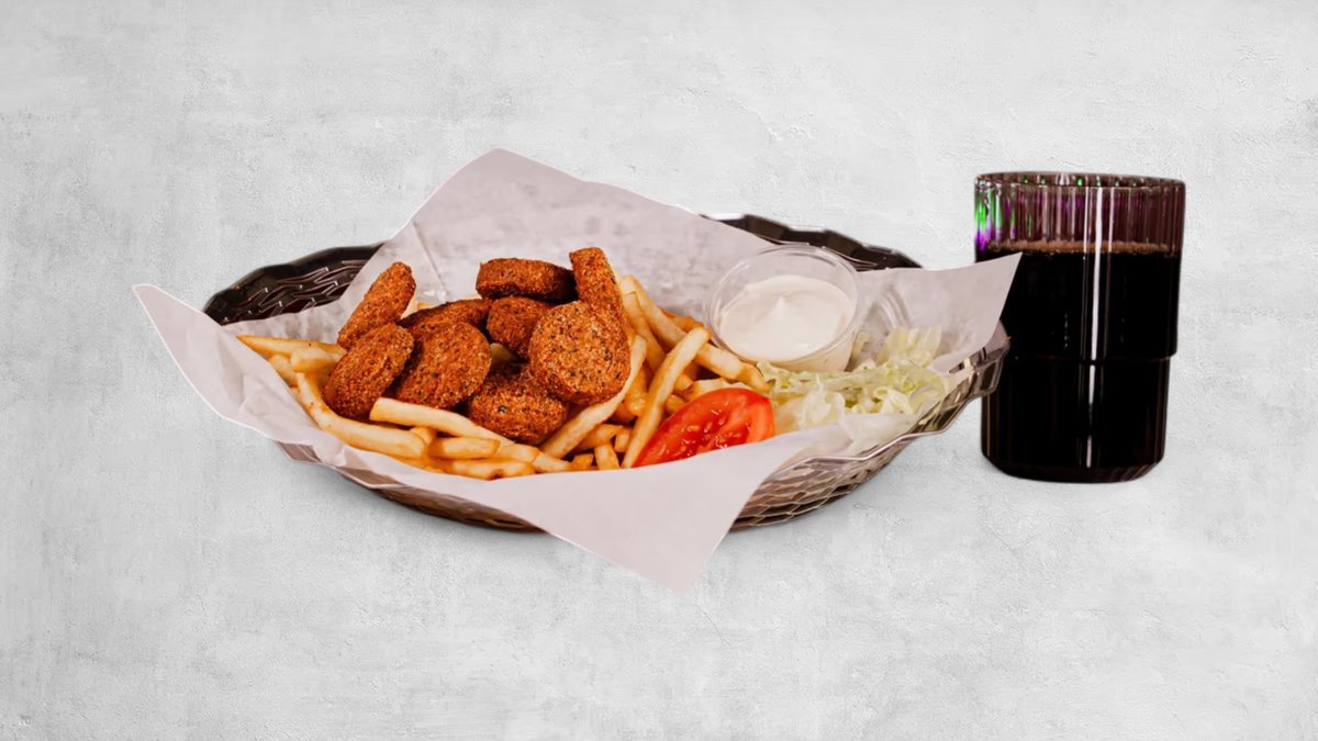 Falafelburgare med sallad, lök, tomat, sweet, hot tomato, strips och dryck. Vegansk.