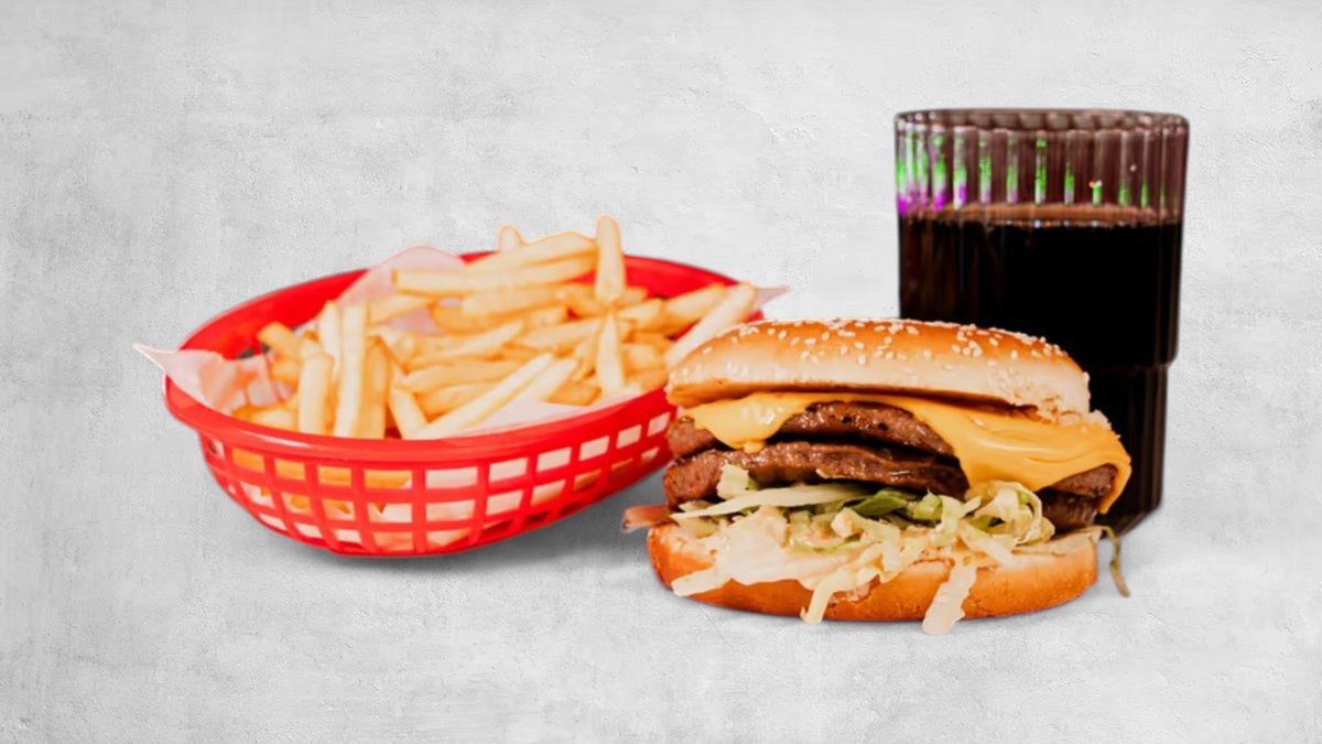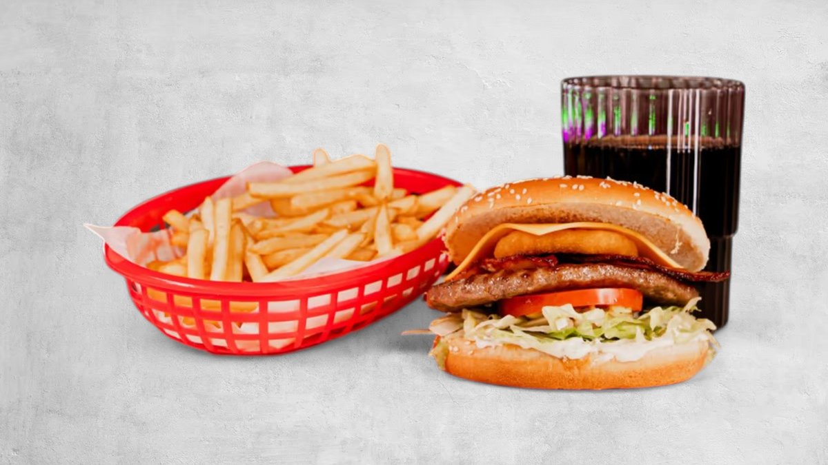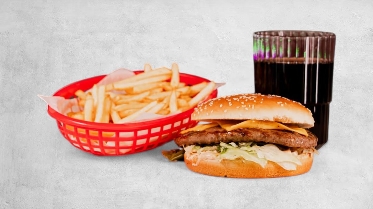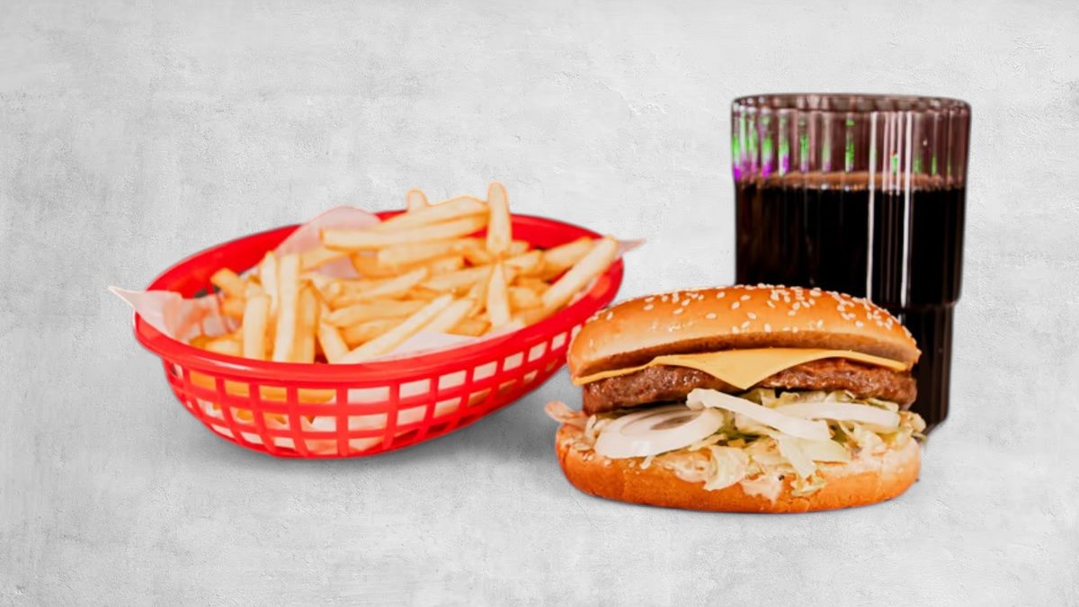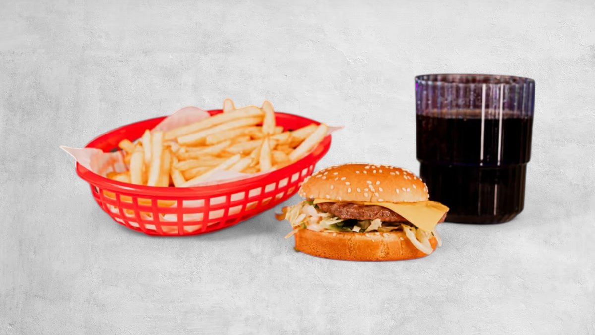 Hamburgare, ost, lök, gurksallad, strips och dryck.