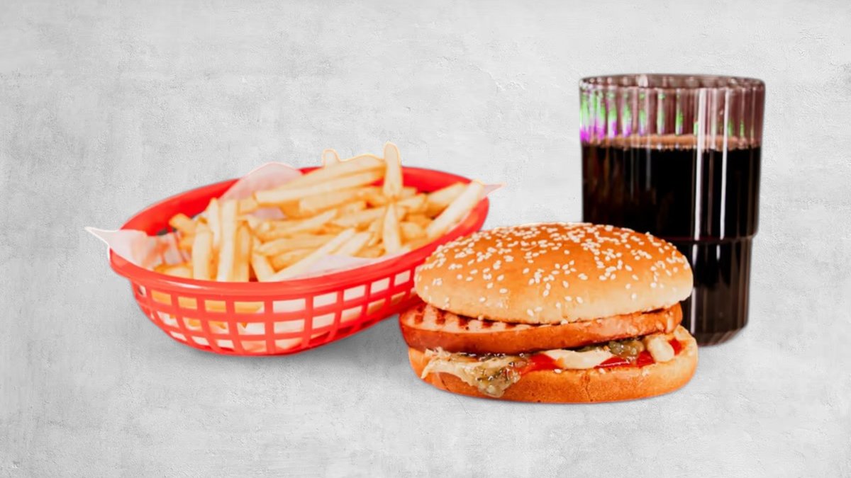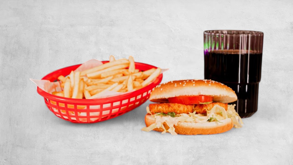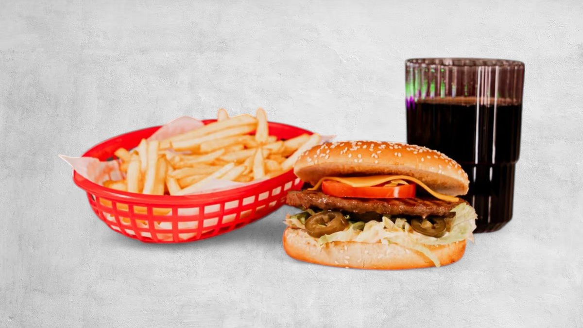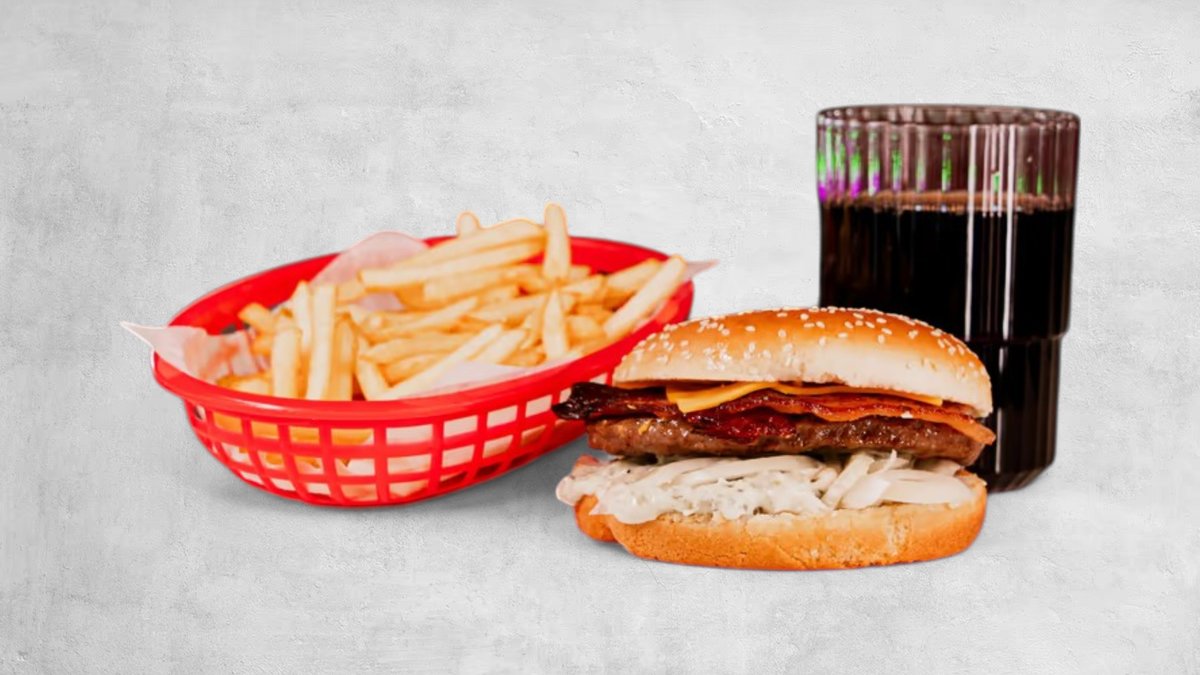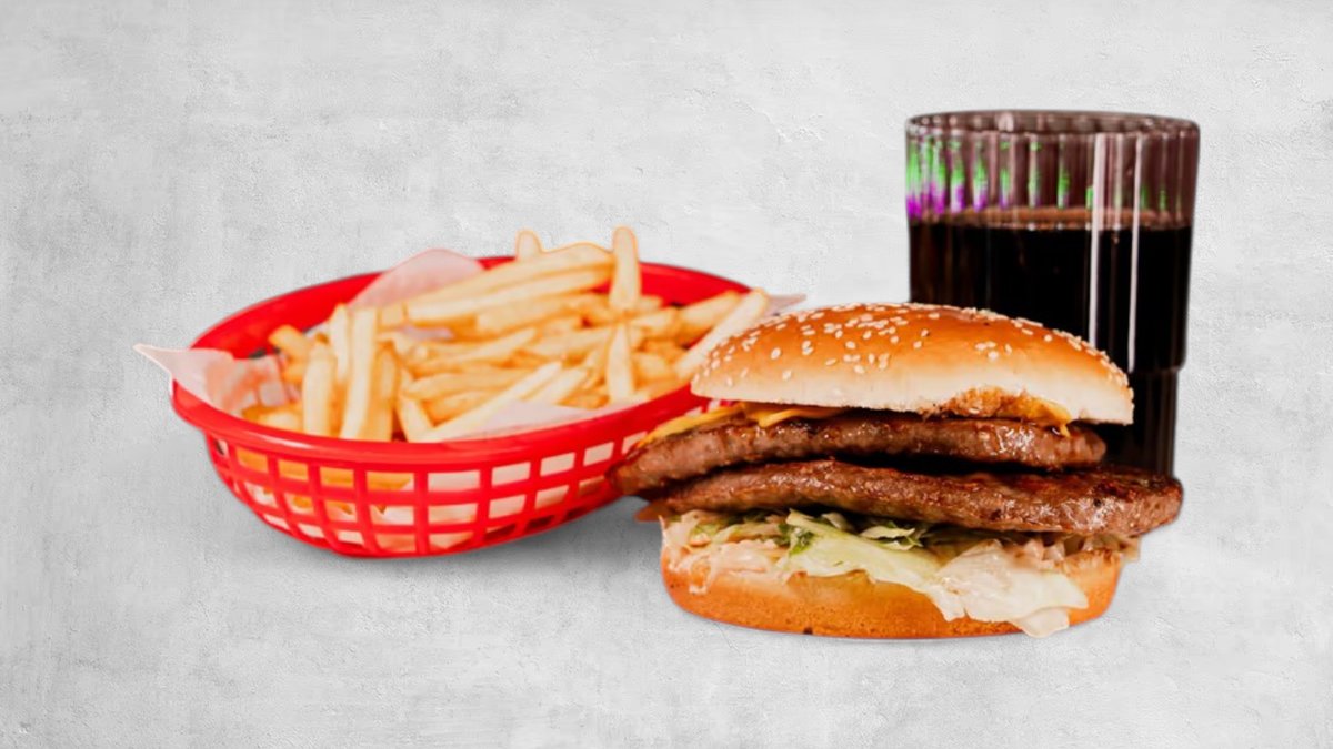 Hamburgare, ost, lök, gurksallad, strips och dryck.