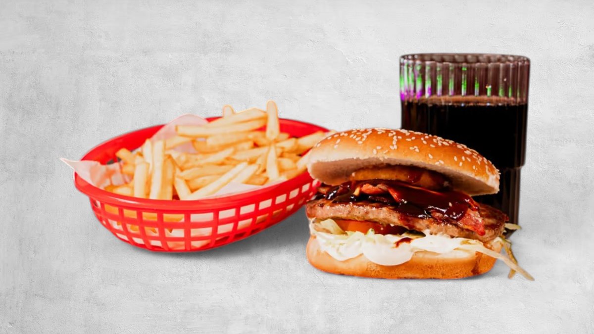 Hamburgare, ost, sallad, tomat, vitlöksdressing, bbqsås, lökring, bacon, strips och dryck.