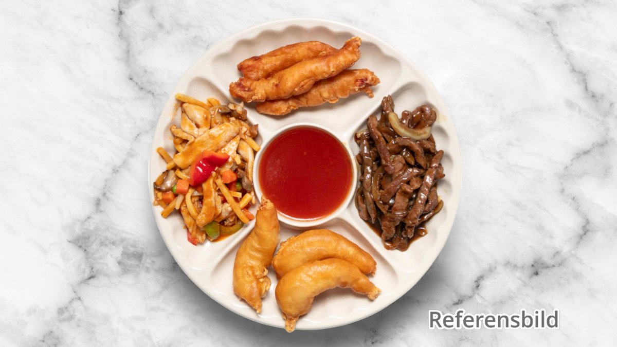 Vårrullar, friterad kyckling, ris och äggnudlar, wok med sötsur sås och grönsaker. Wokad biff med bambuskott och ostronsås. Välj protein i nästa steg!