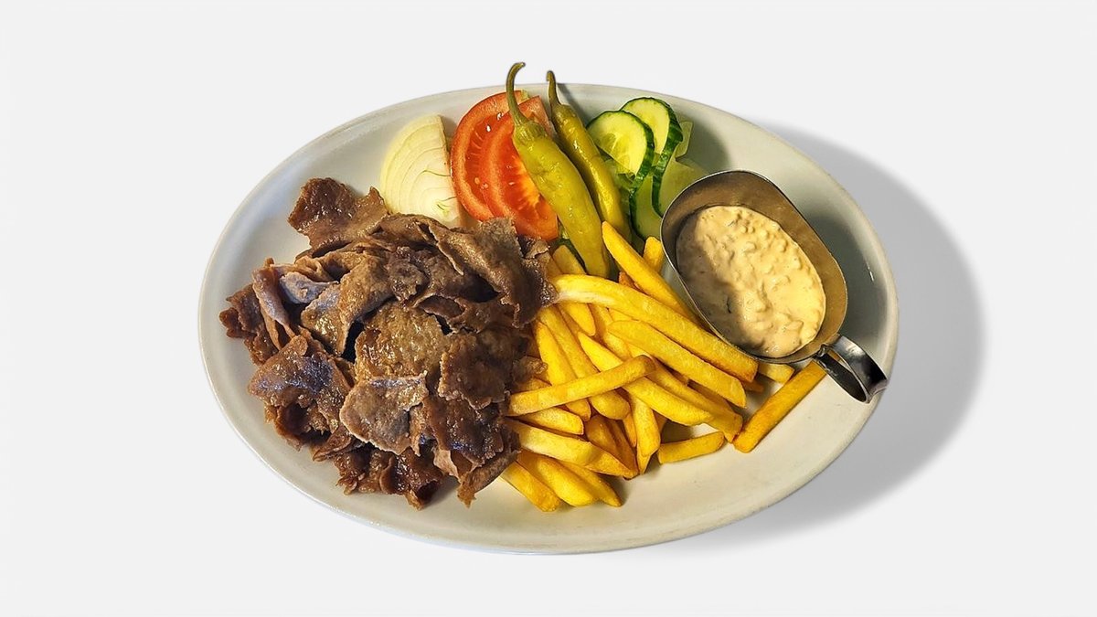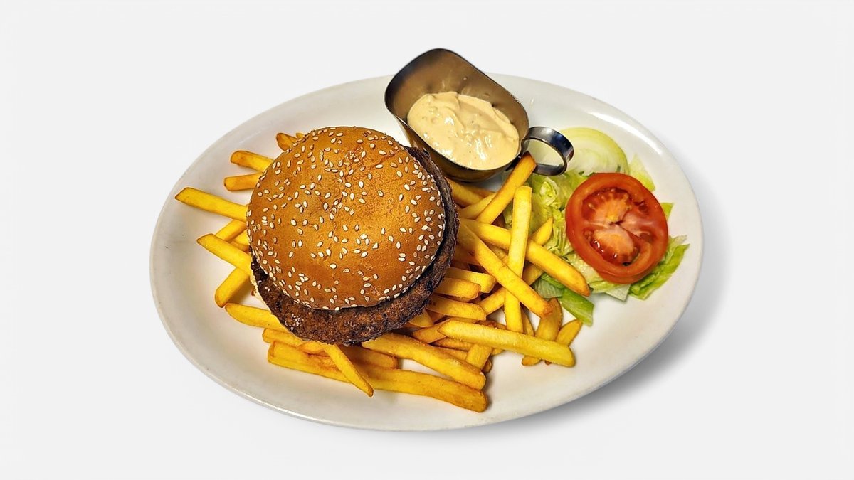 90 g Hamburgare med Pommes Frites. Serveras med Sallad, Lök, tomat och Hamburgerdressing.