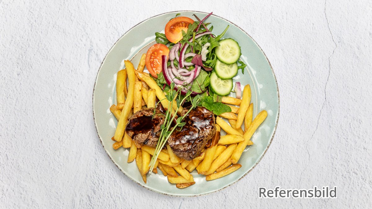 Oxfilé, lök, isbergssallad, gurka, tomater och bearnaisesås.