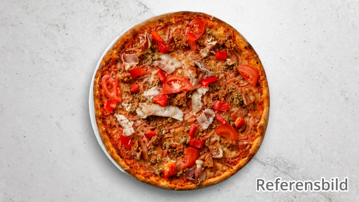 Tomatsås, ost, bacon, salami och fefferoni.