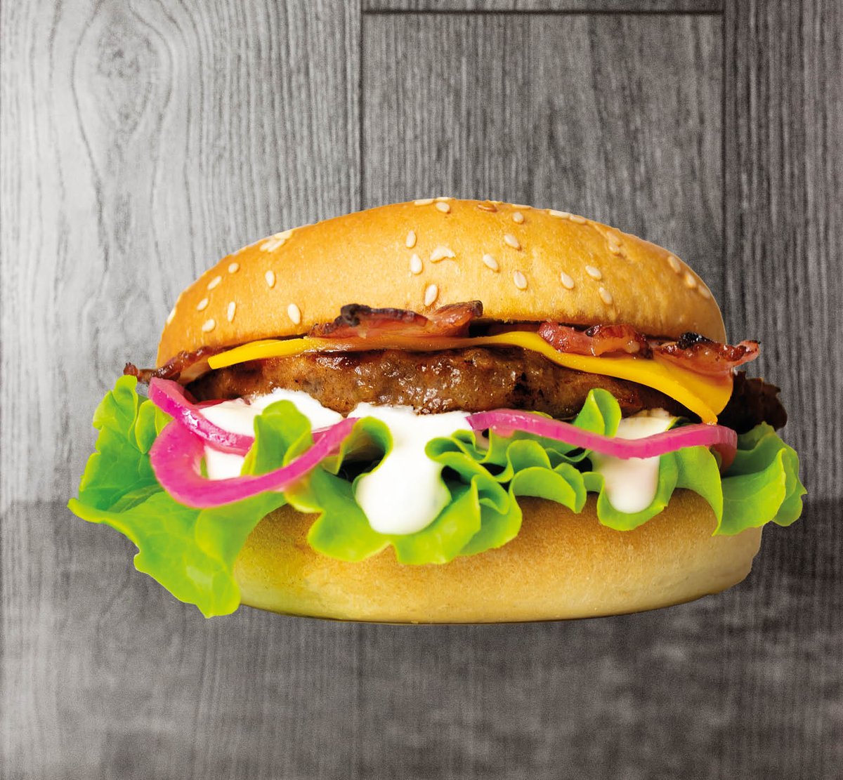 90g Hamburgare med ostskiva, bacon, sourcremedressing, sallad & tomat.