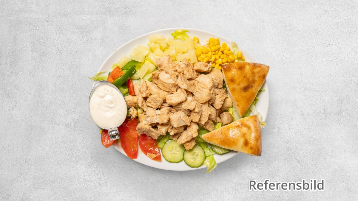 Kyckling, sallad, tomat, gurka, oliver, ost, lök, peperoni och sås.