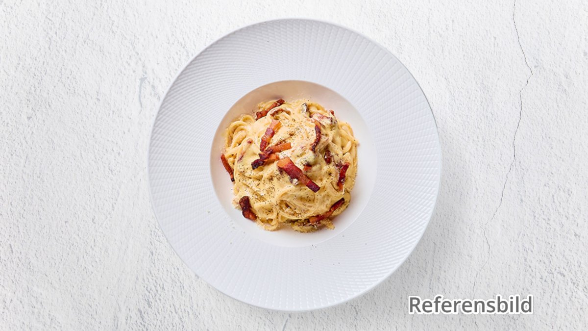 Spaghetti, bacon, svartpeppar, gräddsås, äggula och ost.