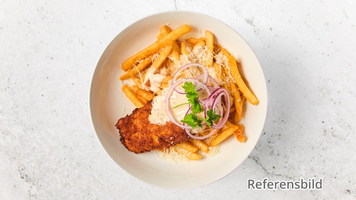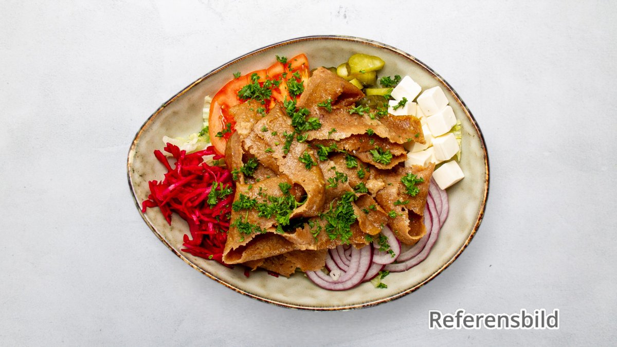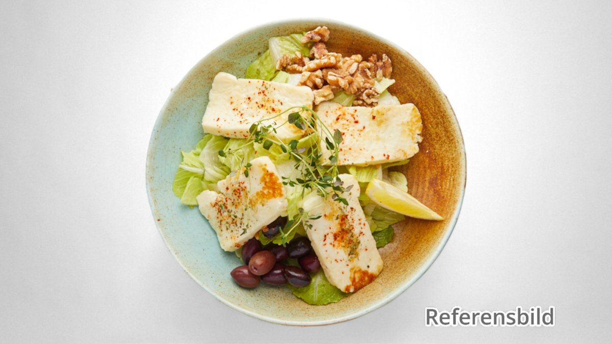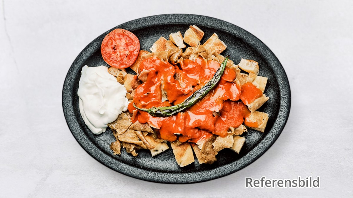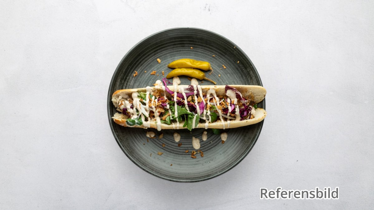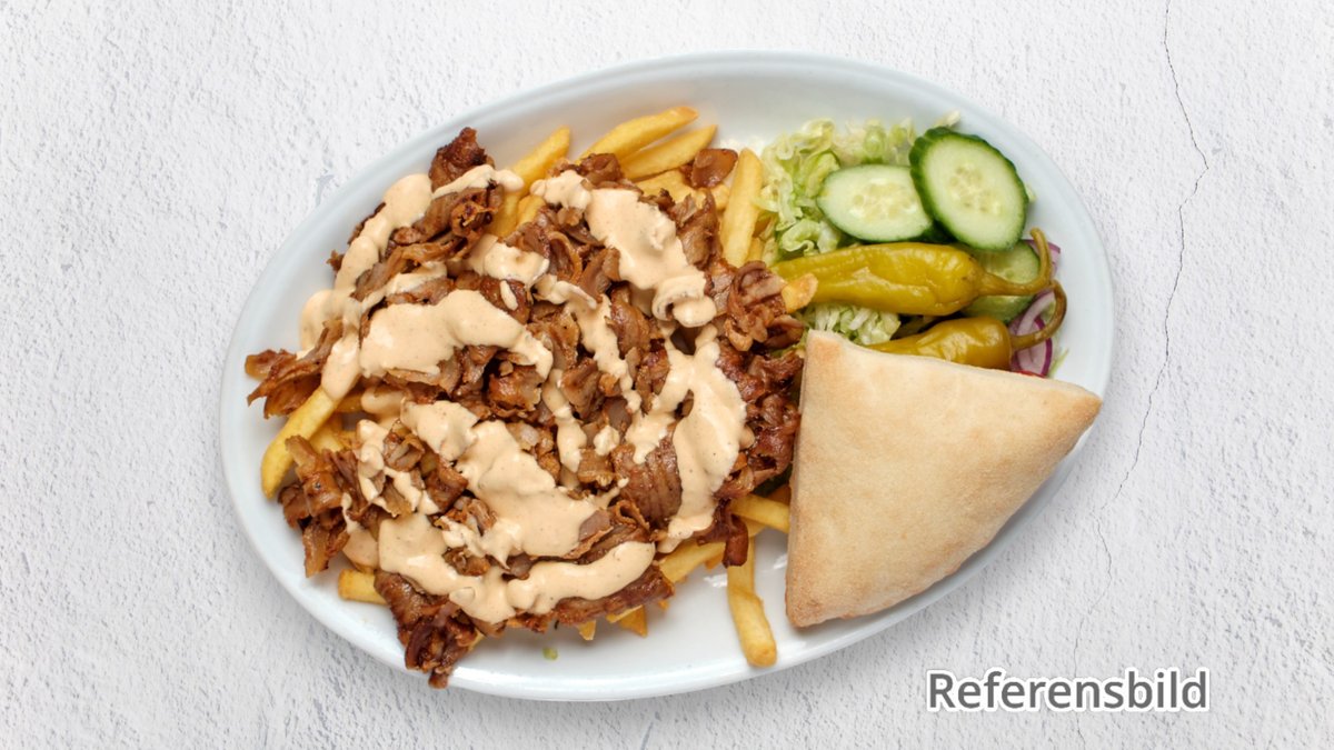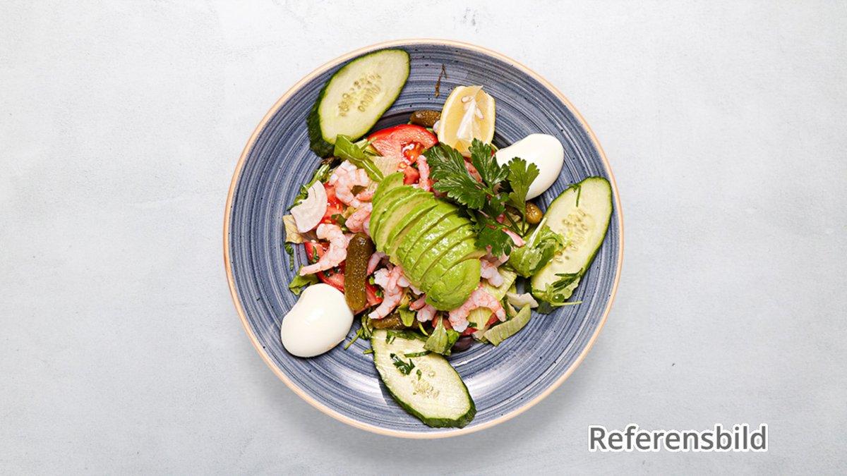 Serveras med isbergssallad, tomat, gurka, lök, rödkål