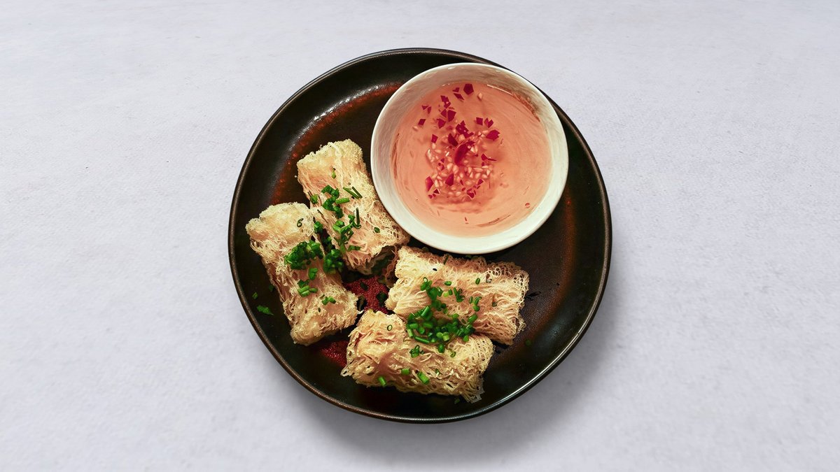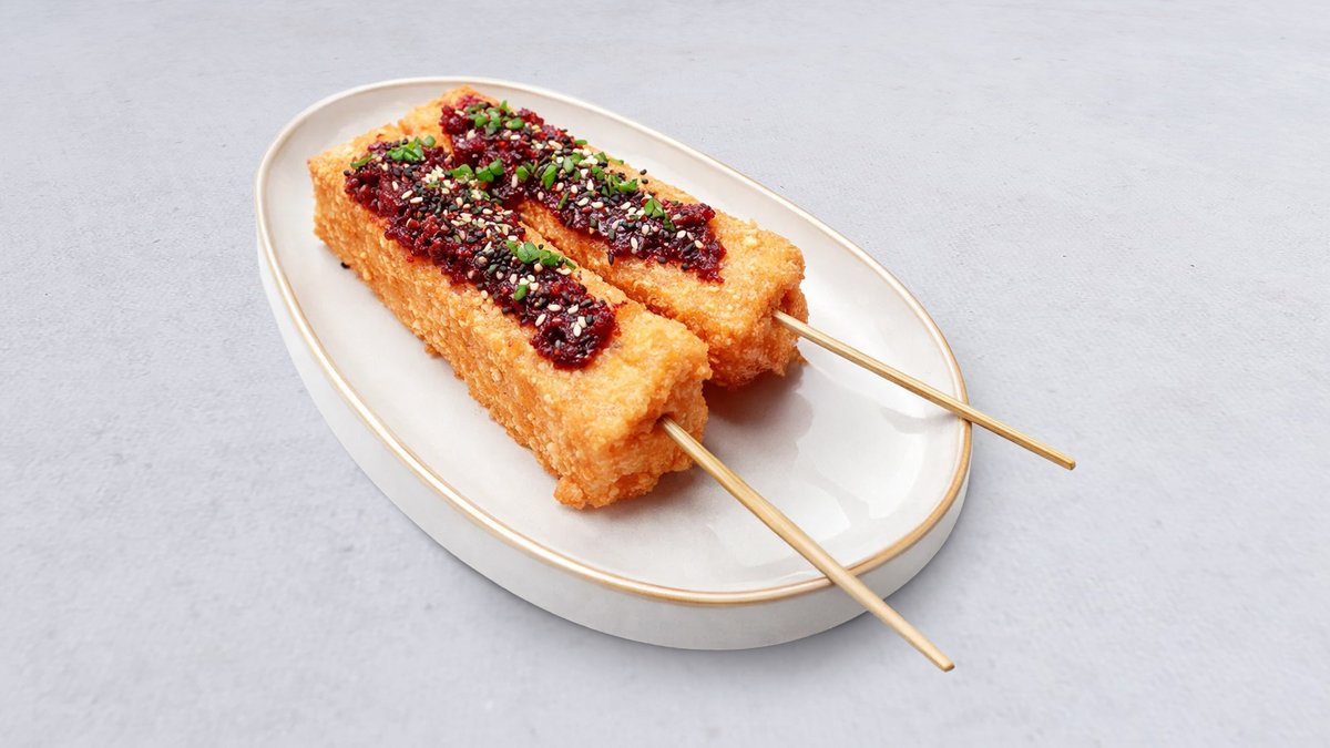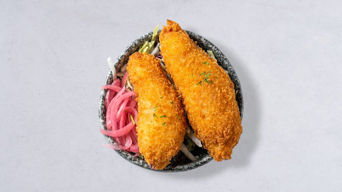 Shrimp, flour, starch, breadcrumbs with japanese mayonnaise and mango sauce.