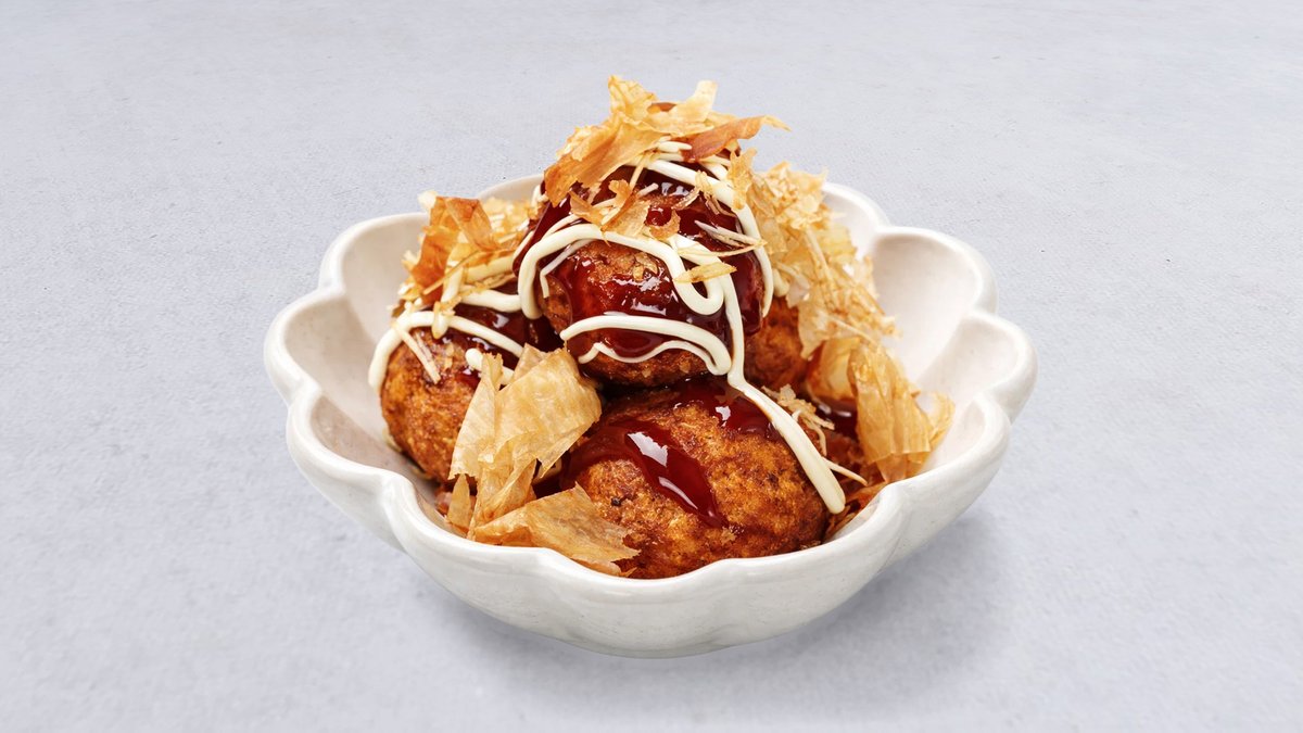 Octopus, flour, Japanese mayonnaise and okonomiyaki sauce. The sauce includes soy sauce, starch and ketchup.