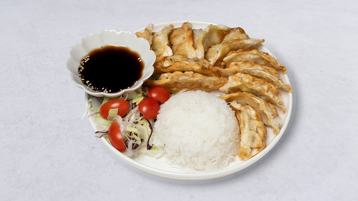 12 pcs dumplings, rice, dumpling sauce, and salad.