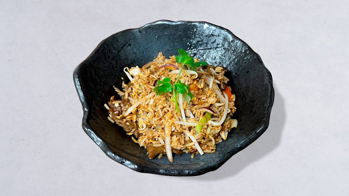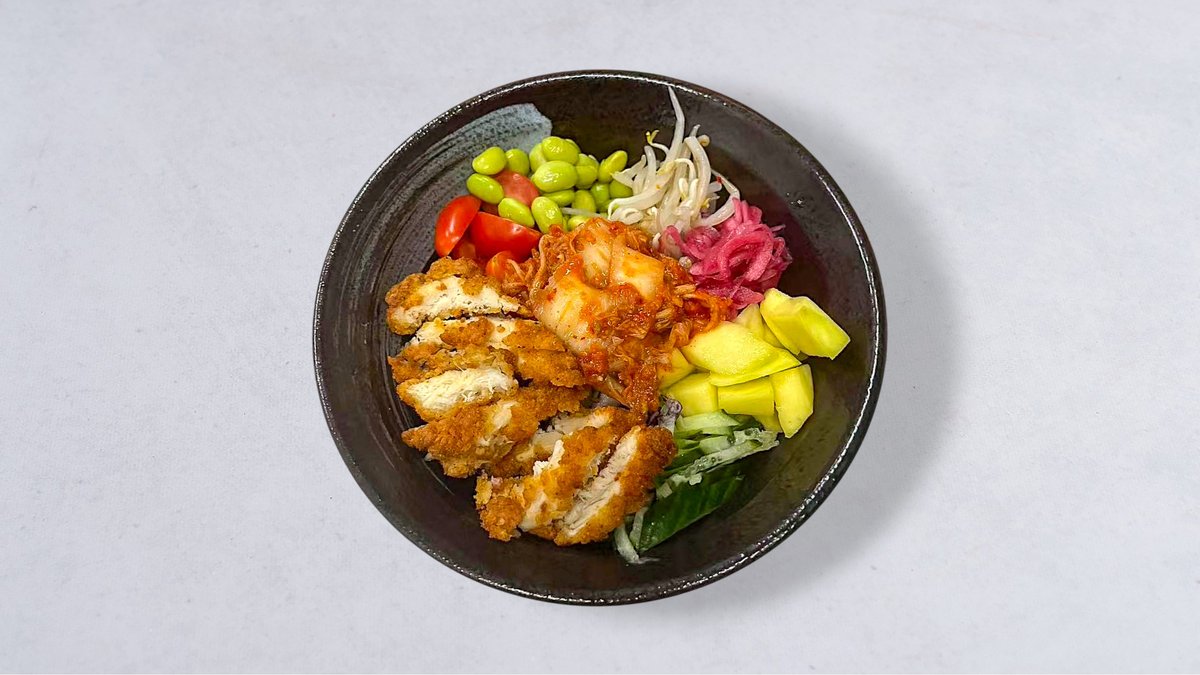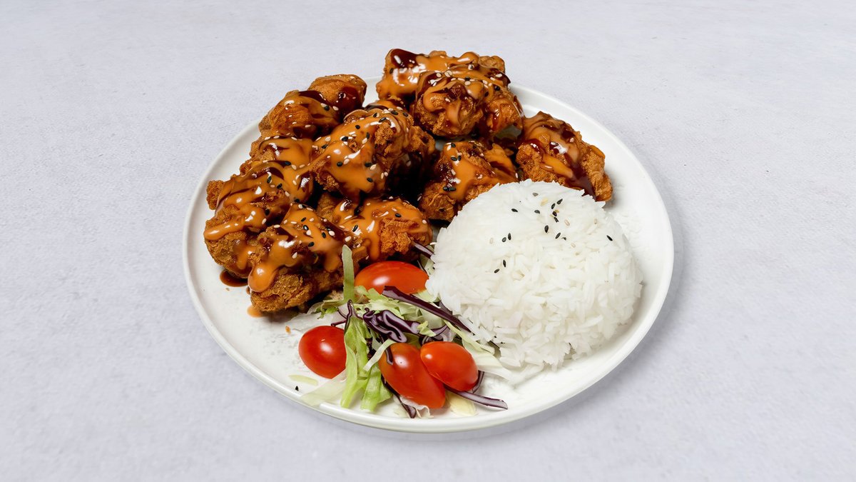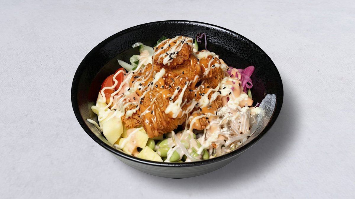 Fried chicken, bean sprouts, red onion, mango, cucumber, cherry tomatoes, mayonnaise and rice.
