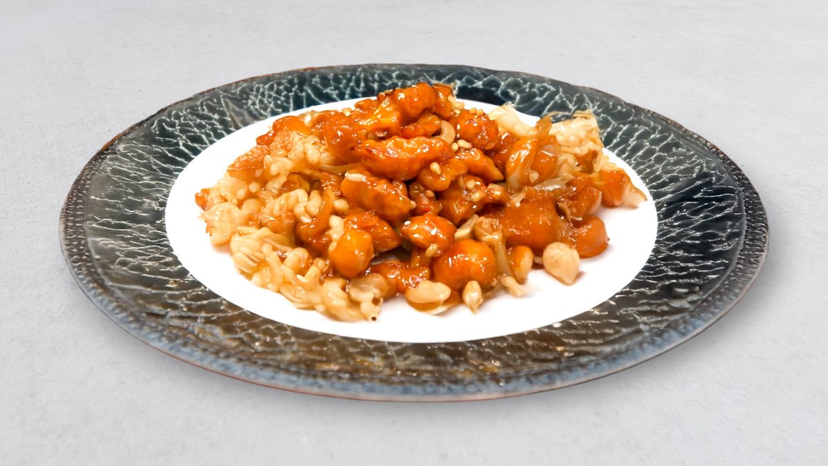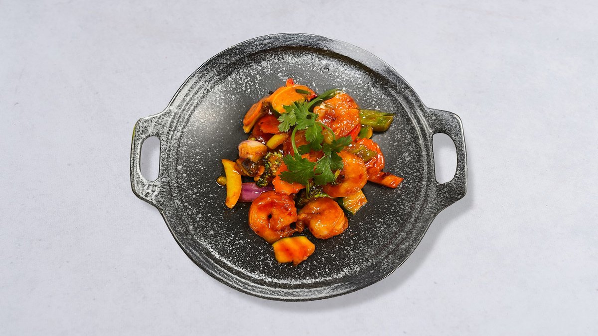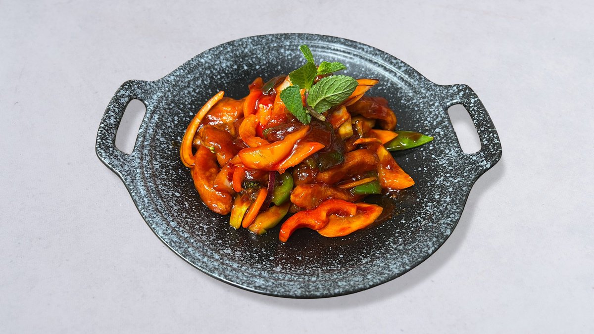 Sweet and sour sauce, bell peppers, onions, broccoli, carrots and zucchini.
