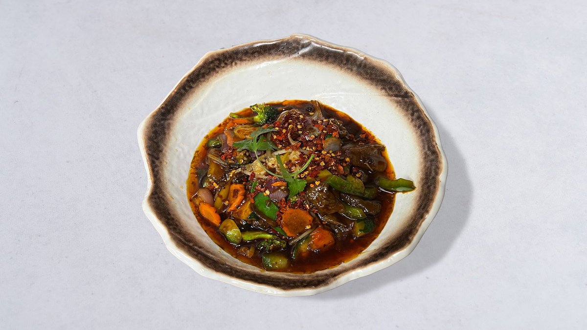 Chili, onion, bean sprouts, broccoli, carrot, mushroom, Sichuan pepper oil and sesame oil. Very stong.