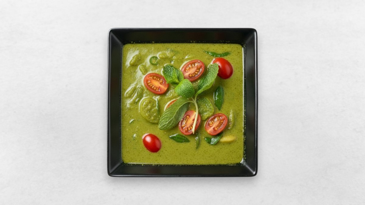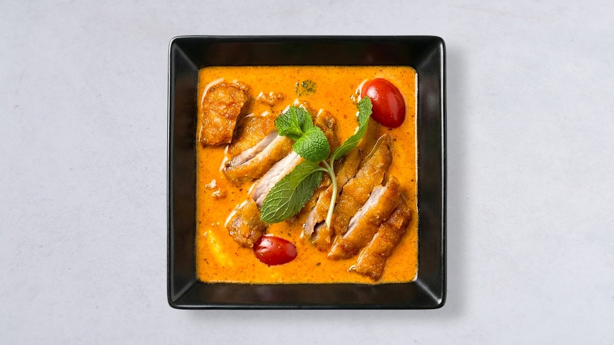 Roasted duck meat, curry sauce, coconut milk, enoki mushrooms, tomatoes, broccoli and bamboo shoots.