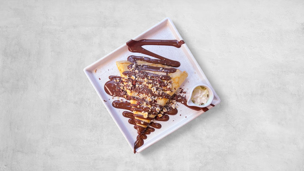 Vår underbara fransk crêpe fylld med mjölk smältchoklad eller nutella. Lägg till toppings i nästa steg.