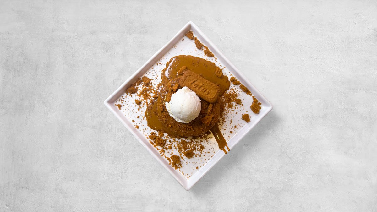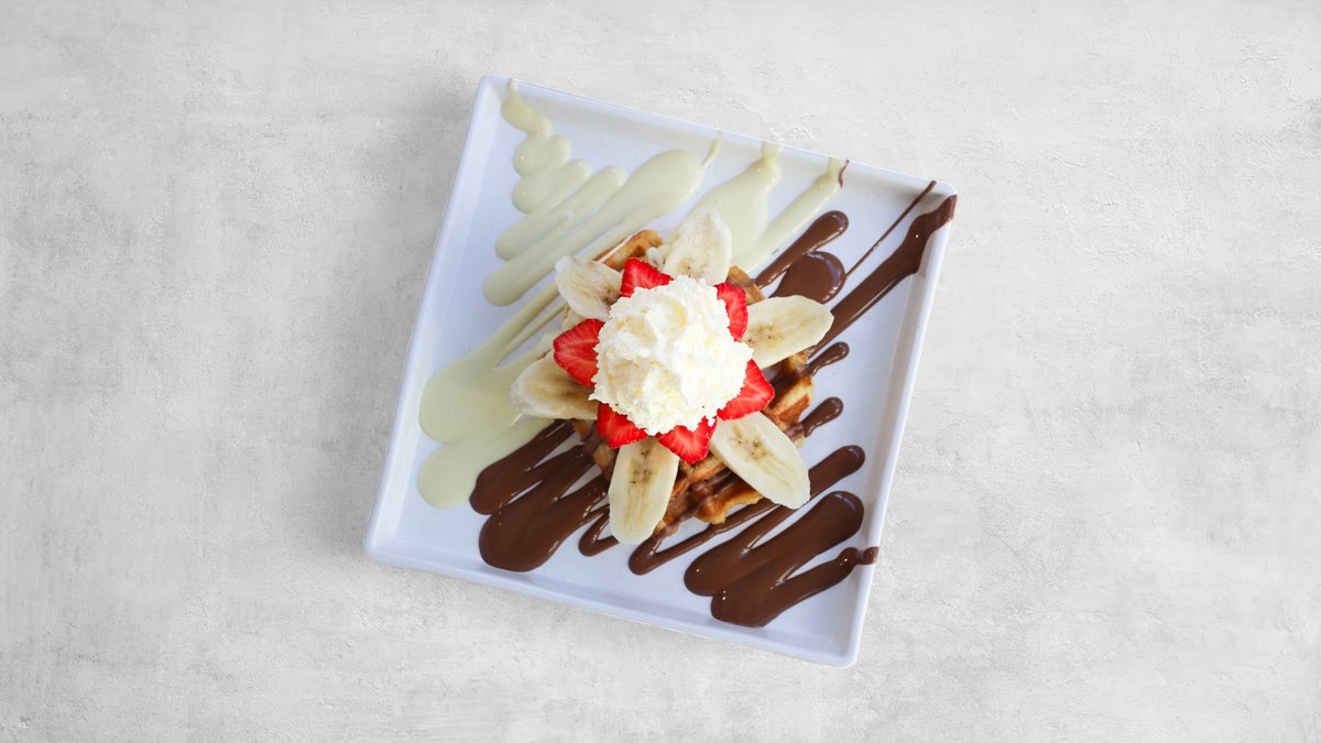 Belgisk våffla med dulce de leche, vaniljkräm, banan, kex, vaniljglass och mörk choklad.