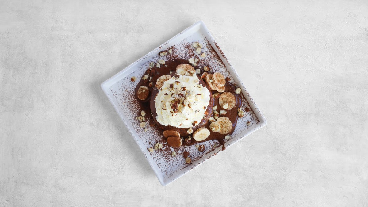 Fluffiga amerikanska pannkakor, Nutella, banan, hasselnötter och grädde.