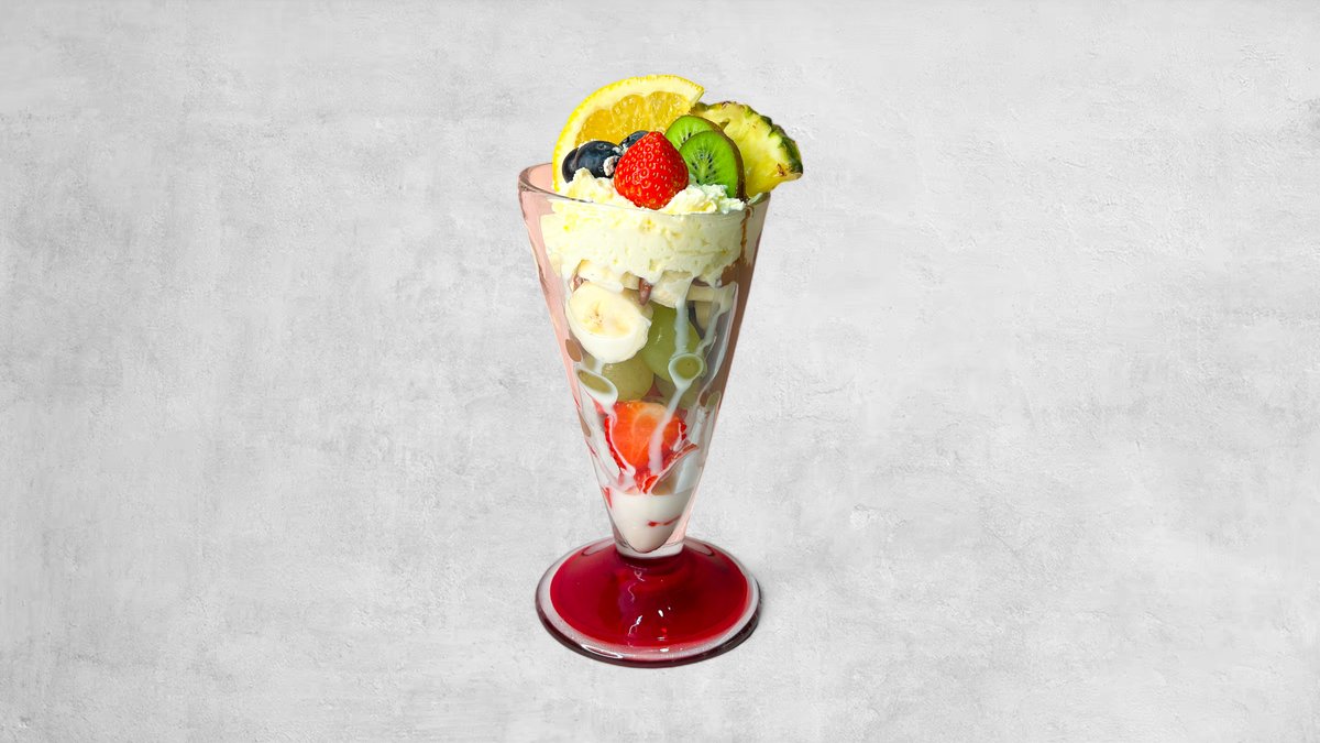 Belgisk våffla med vaniljkräm, citronkräm, ananas, apelsin, kiwi, mango, blåbär, kex, vaniljglass och kokos flakes.