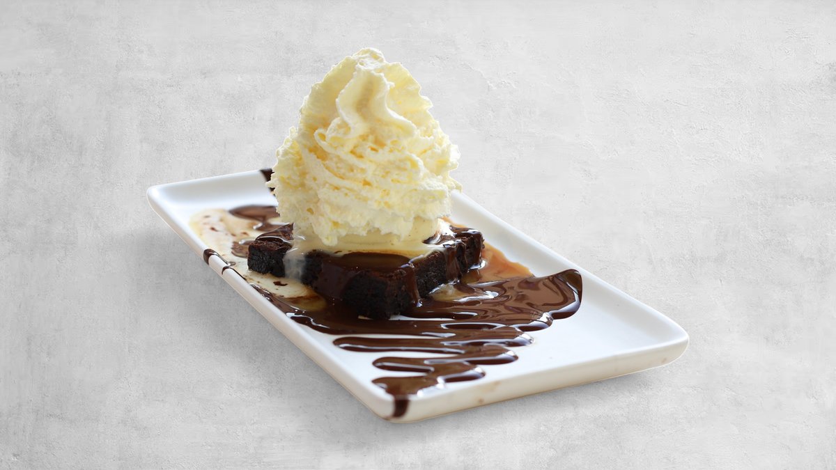 Varm brownie toppade med smältchoklad, kolasås, vaniljglass och grädde.