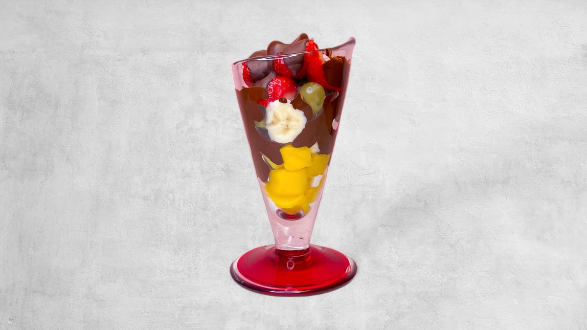 Fruktsallad gjord på jordgubbar, banan, vindruvor, mango och smält mörk choklad.