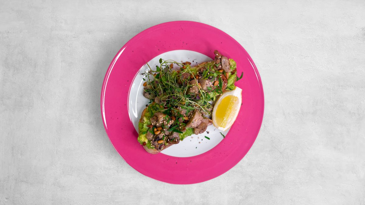 Fluffigt brioche bröd med avokado, fetaost och färsk granatäpplekärnor.