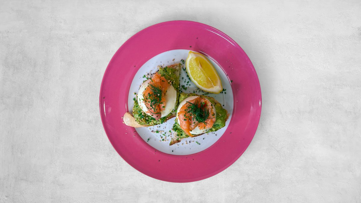Surdegsbröd med avokado, två pocherade ägg och kallrökt lax.