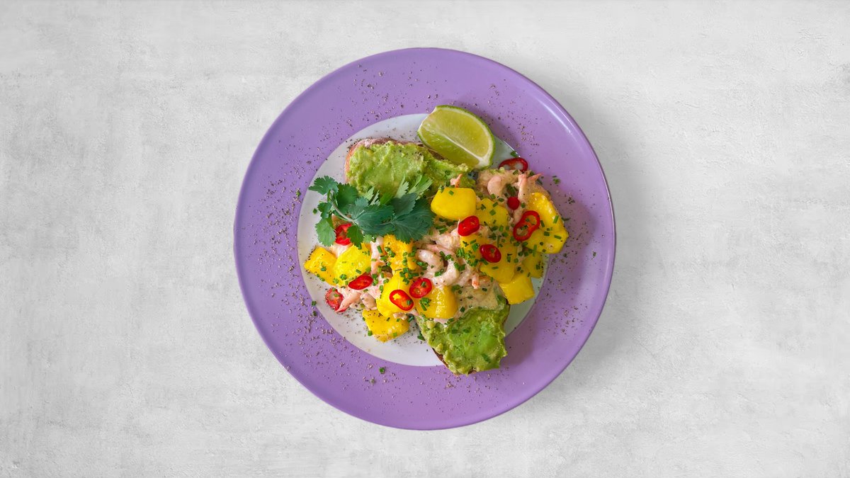 Surdegstoast med avokado, handskalade räkor, mango, koriander, limeklyfta och färsk chili.