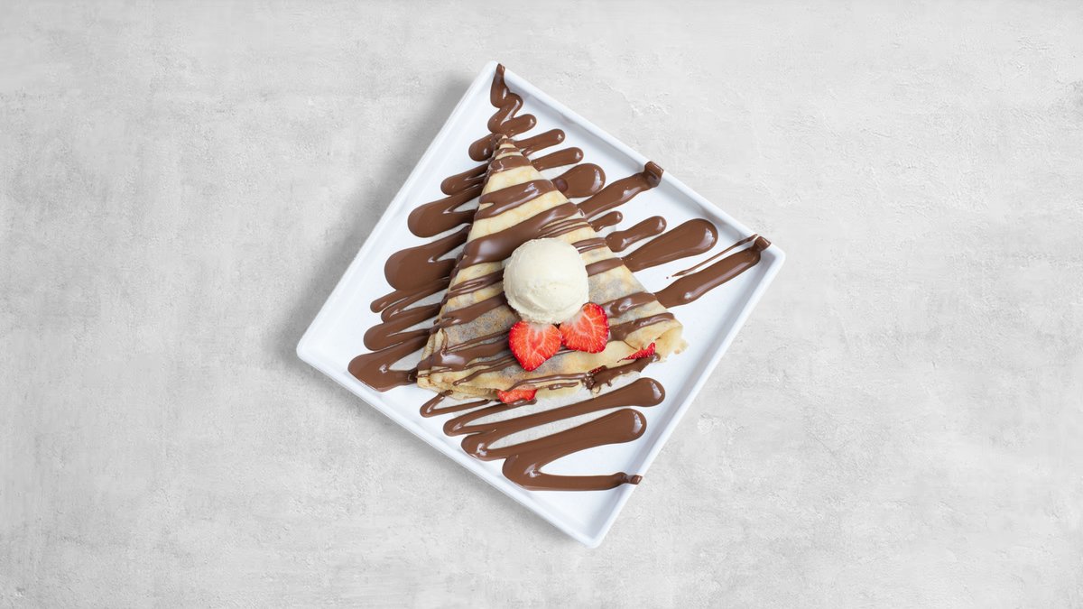 Bovete crêpe med mjölkchoklad, jordgubbar och vaniljglass.
