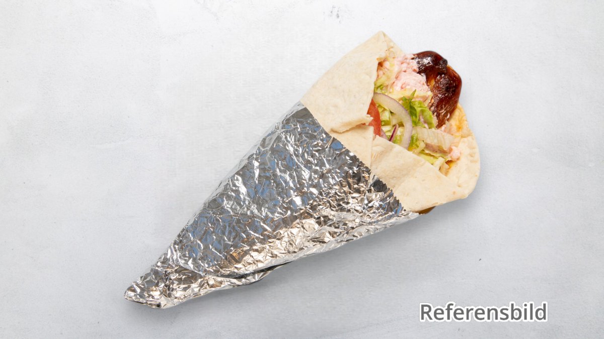 Kebabrulle i tunnbröd med grönsaker, pepperoni och valfri sås.