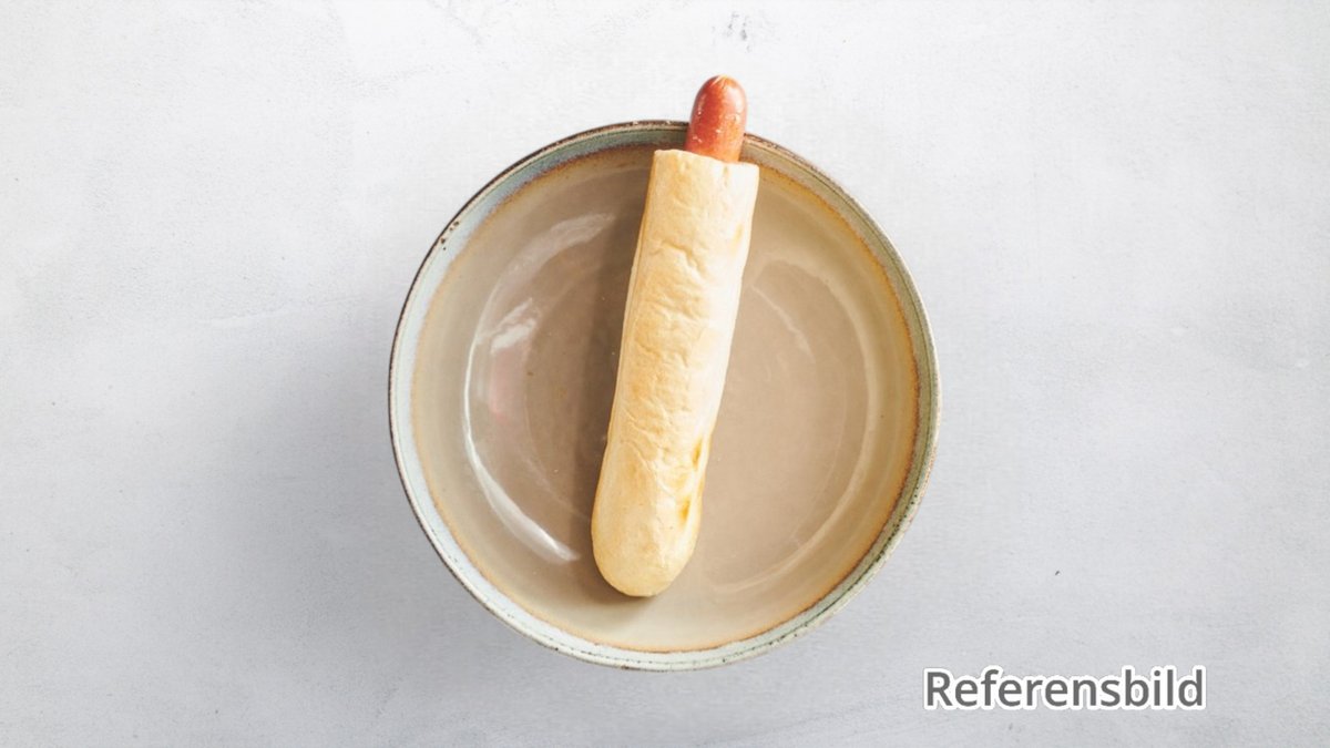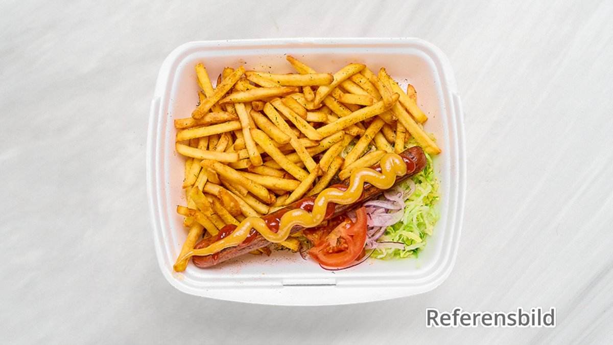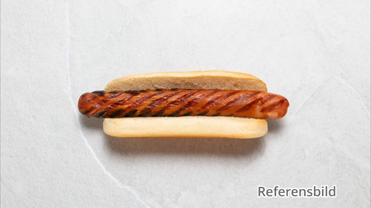 Valfri tjockkorv i baguettebröd med valfri dressing.