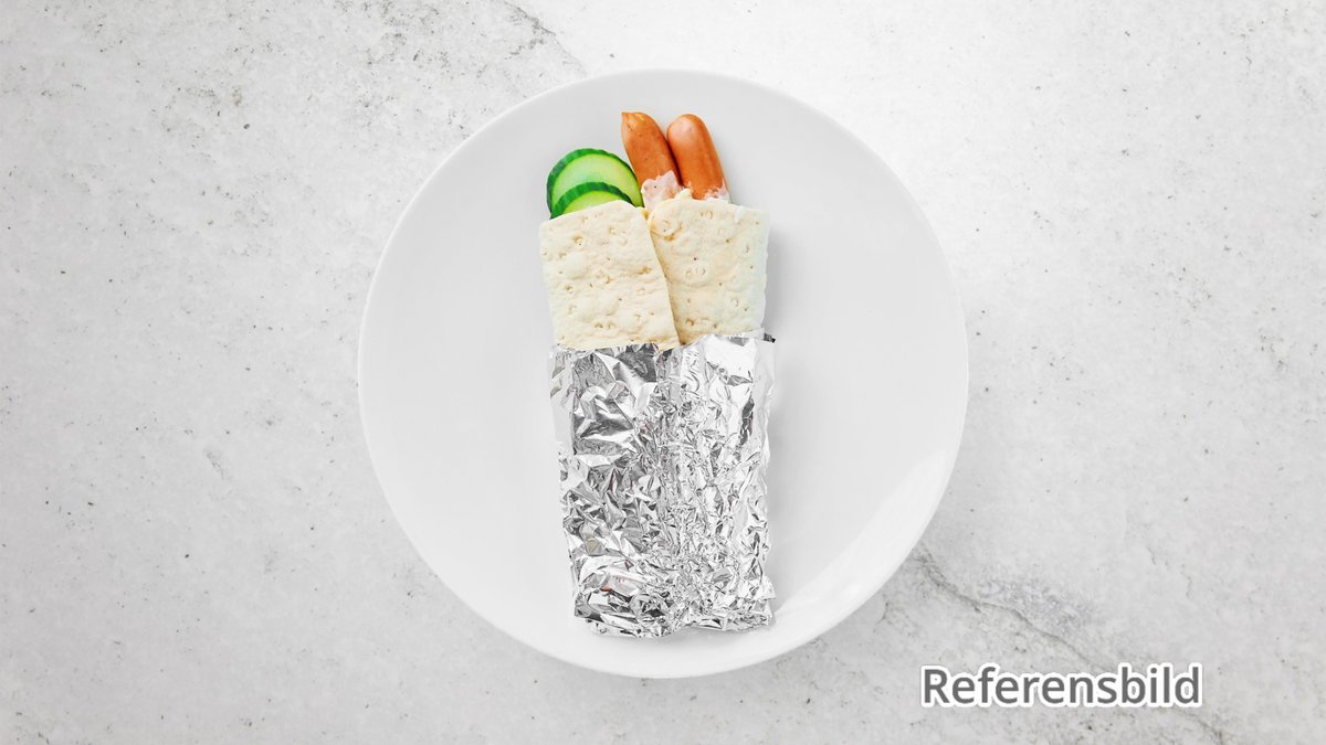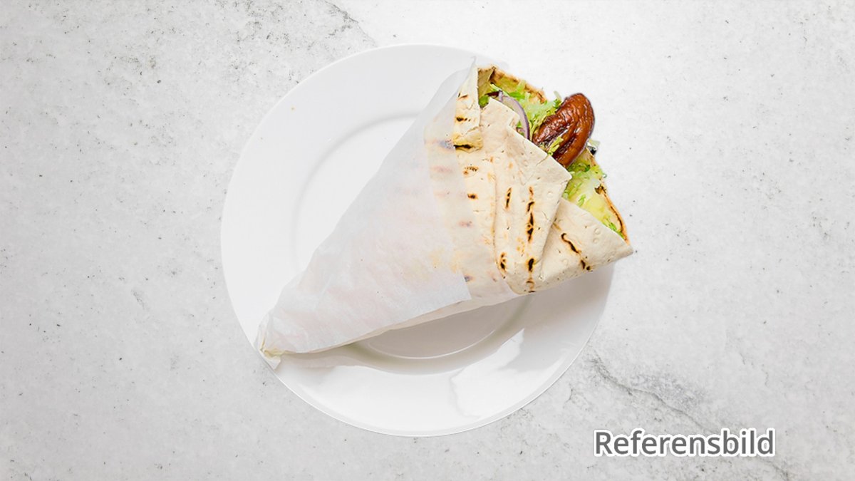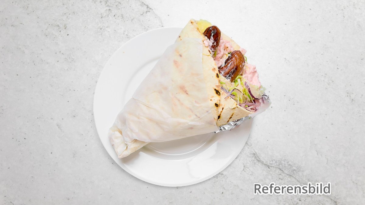 Korvrulle i tunnbröd med grönsaker och valfri sås.