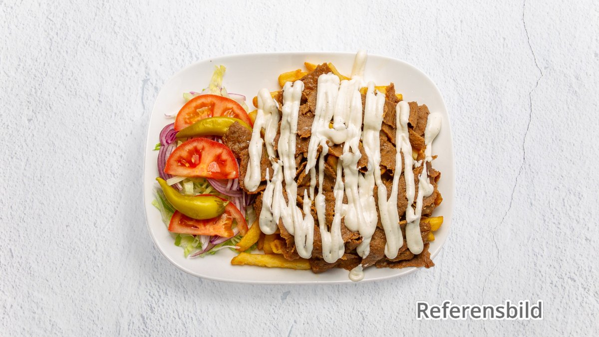 Serveras med kebabkött och gyroskött, strips eller mos, grönsaker, fefferoni och valfri sås.
