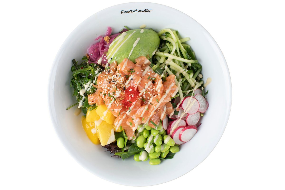 Sushiris, salladsmix, mango, avokado, edamamebönor, rödlök, strimlad gurka, skivade rödbetor, goma wakame och sesamfrön. Serveras med vår egna poké-majonnäs.
