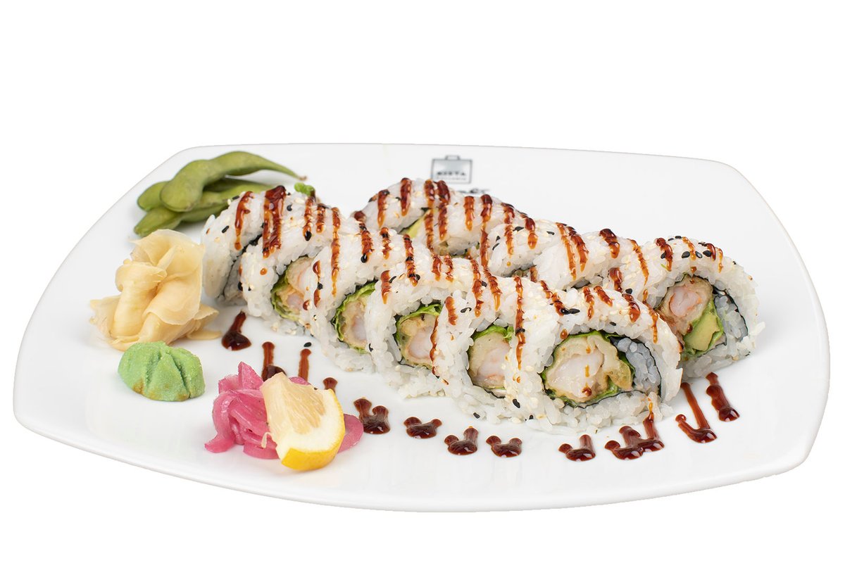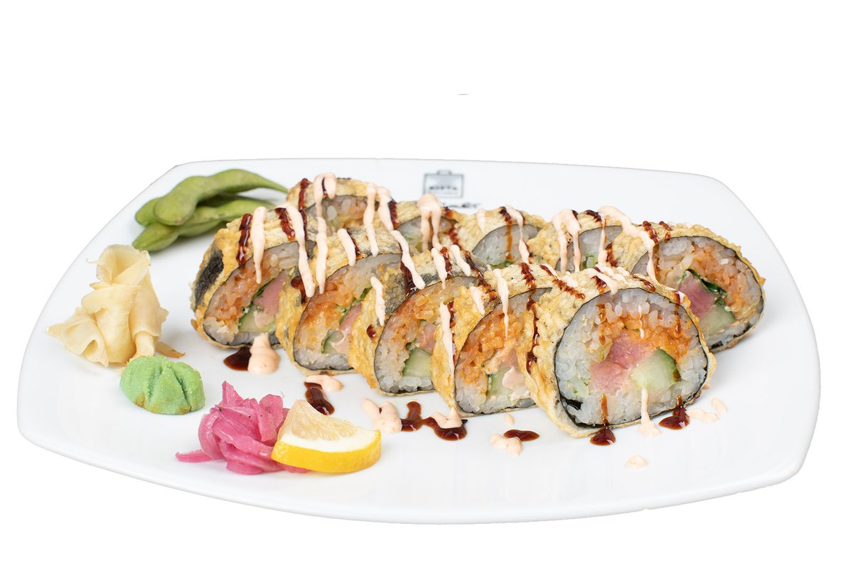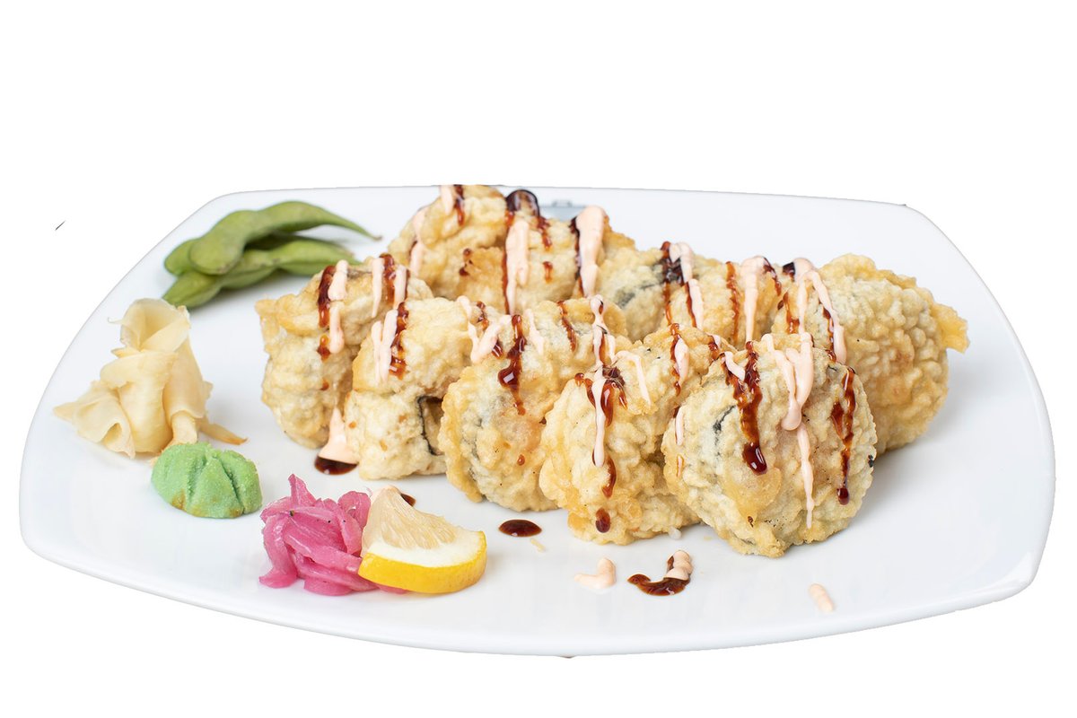 Friterade rullar med lax, avokado och crabfish. Toppad med chilimajonnäs och ålsås.