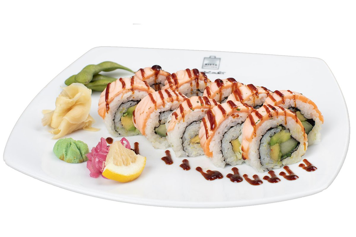 Halstrad lax, avokado, gurka och chilimajonnäs. Toppad med ålsås.
