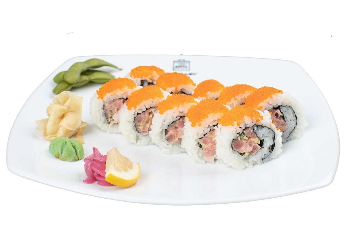 Stark. Friterade rullar med tonfisk, gurka, avokado, koriander och chilisås. Toppad med chilimajonnäs och ålsås.
