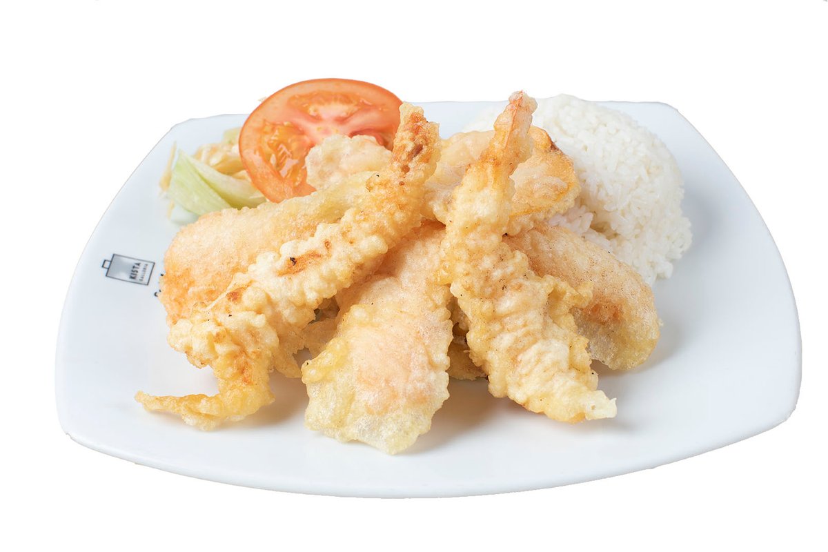 Friterade rullar med lax, avokado, gurka och räkor. Serveras med mangomajonnäs.