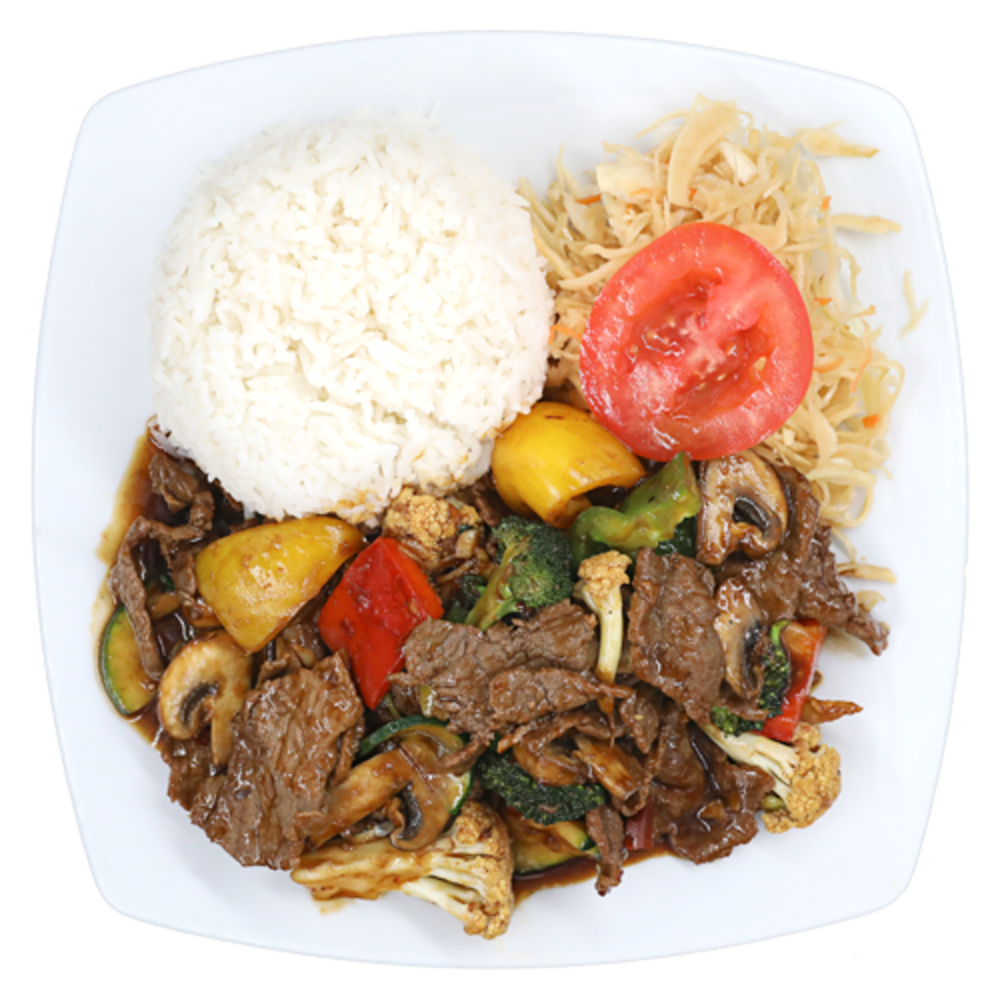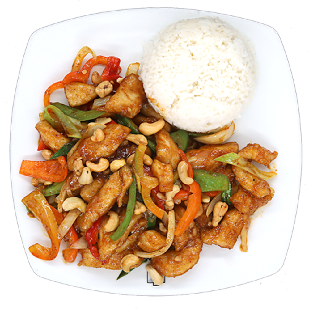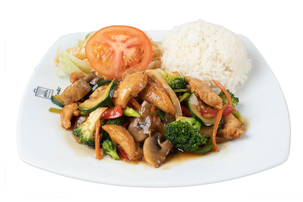 Wokad kyckling med grönsaker i söt sojasås. Serveras med ris.