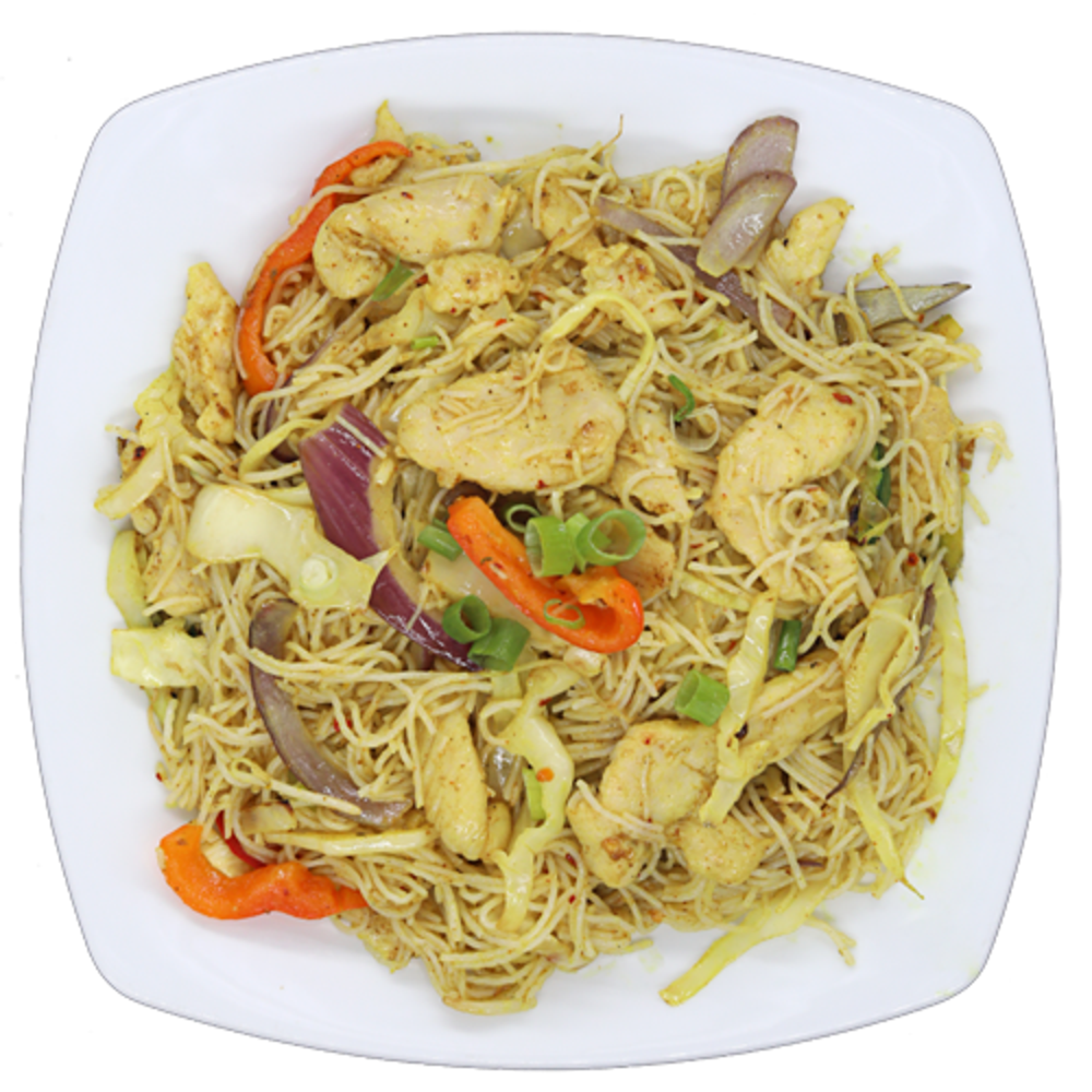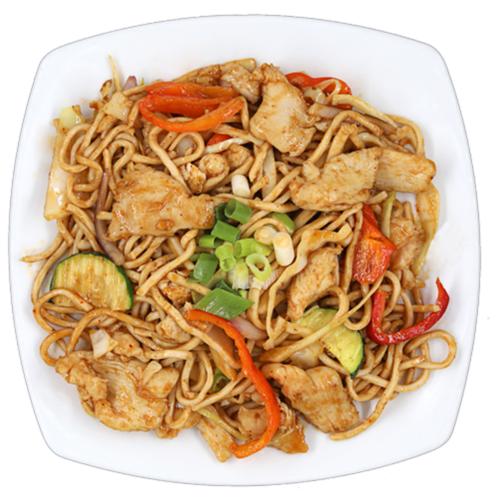 Wokade hemgjorda nudlar med ägg och grönsaker i vår egen sås.