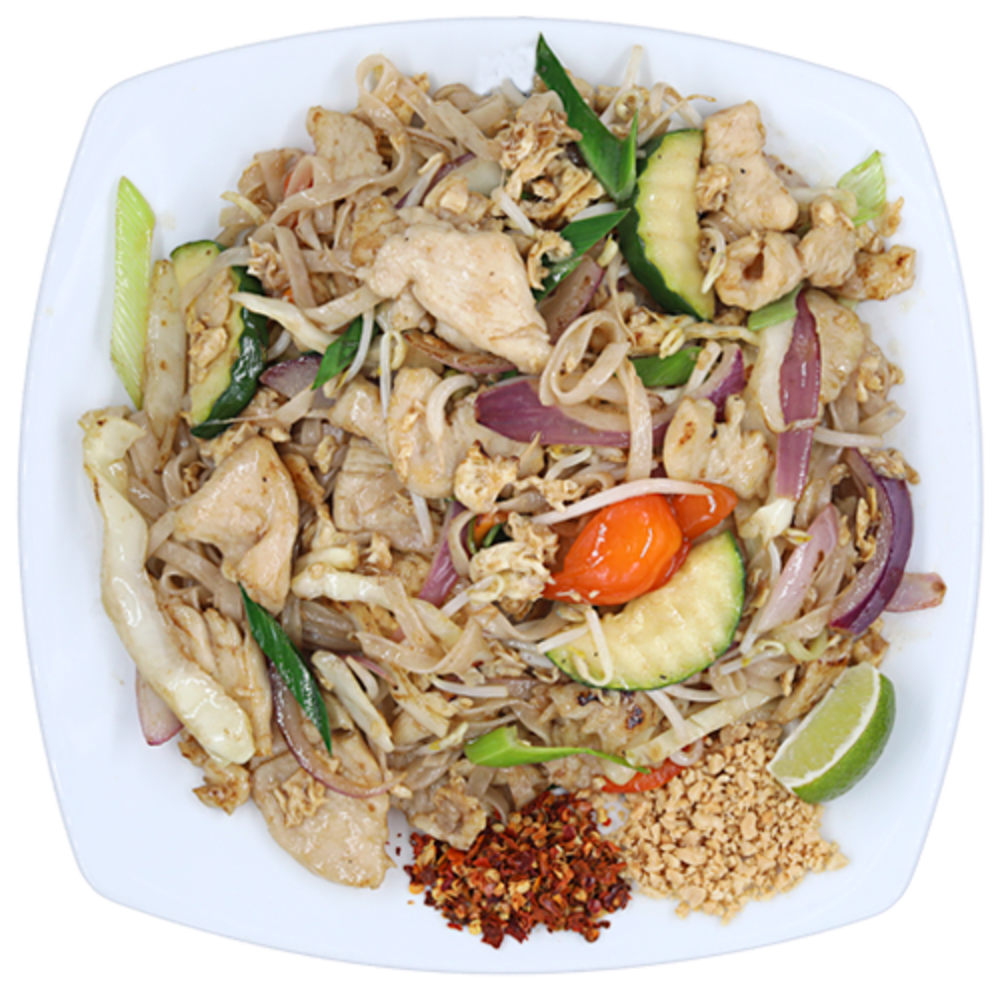 Wokade risnudlar med ägg och grönsaker. Toppas med krossade jordnötter, chillflakes och lime.