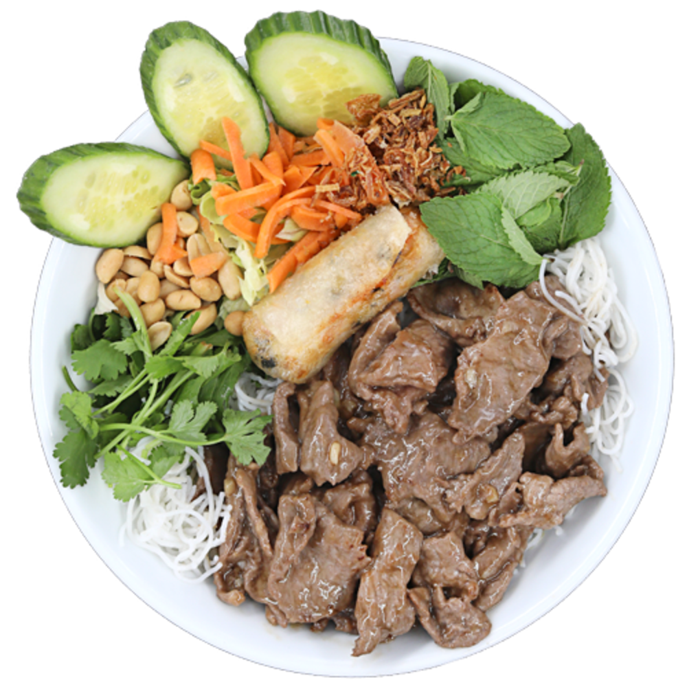 Nudelsallad med biff, jordnötter, grönsaker, friterad vårrulle, rostad lök, koriander och mynta.