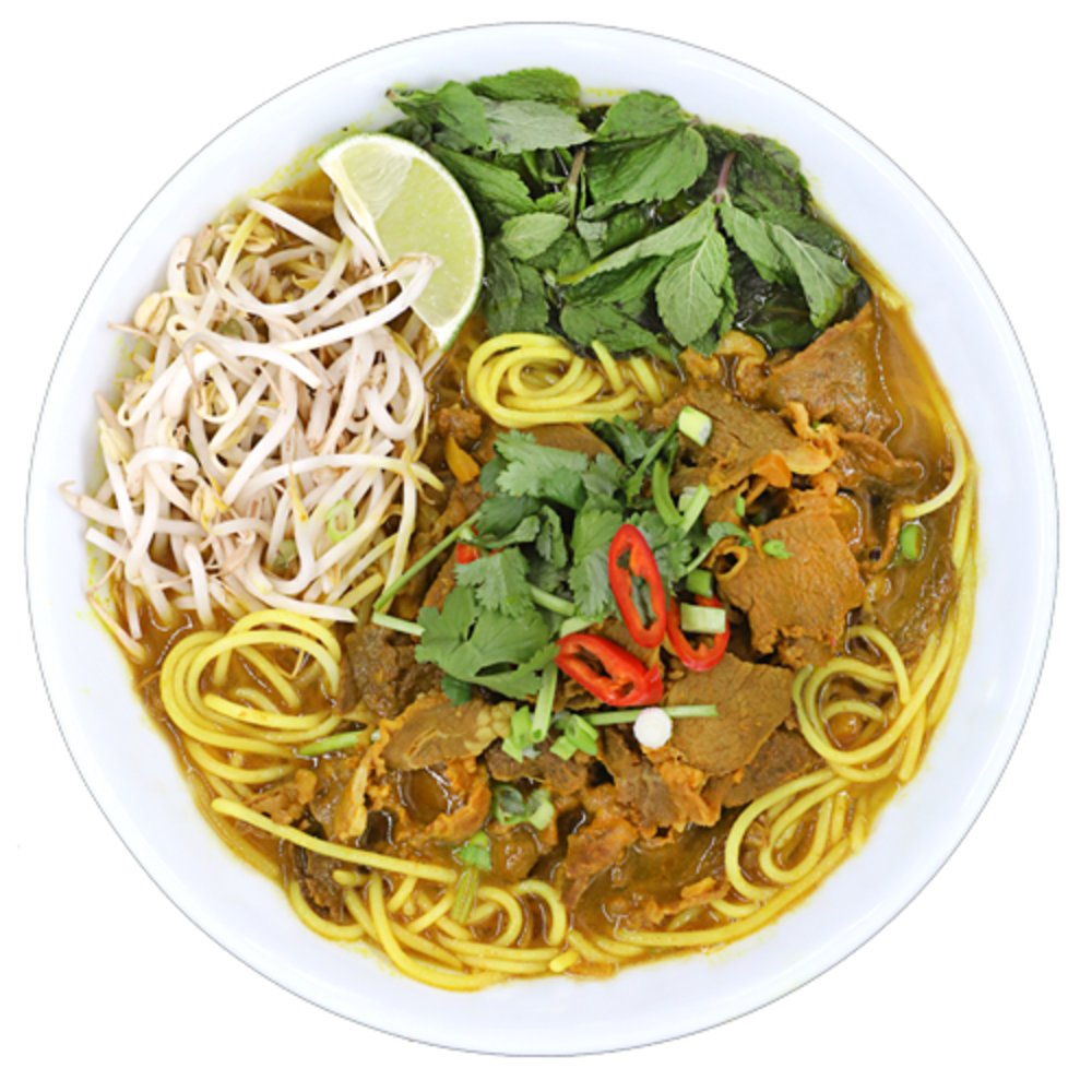 Kryddig risnudelsoppa med biff, böngroddor, curry och mynta.