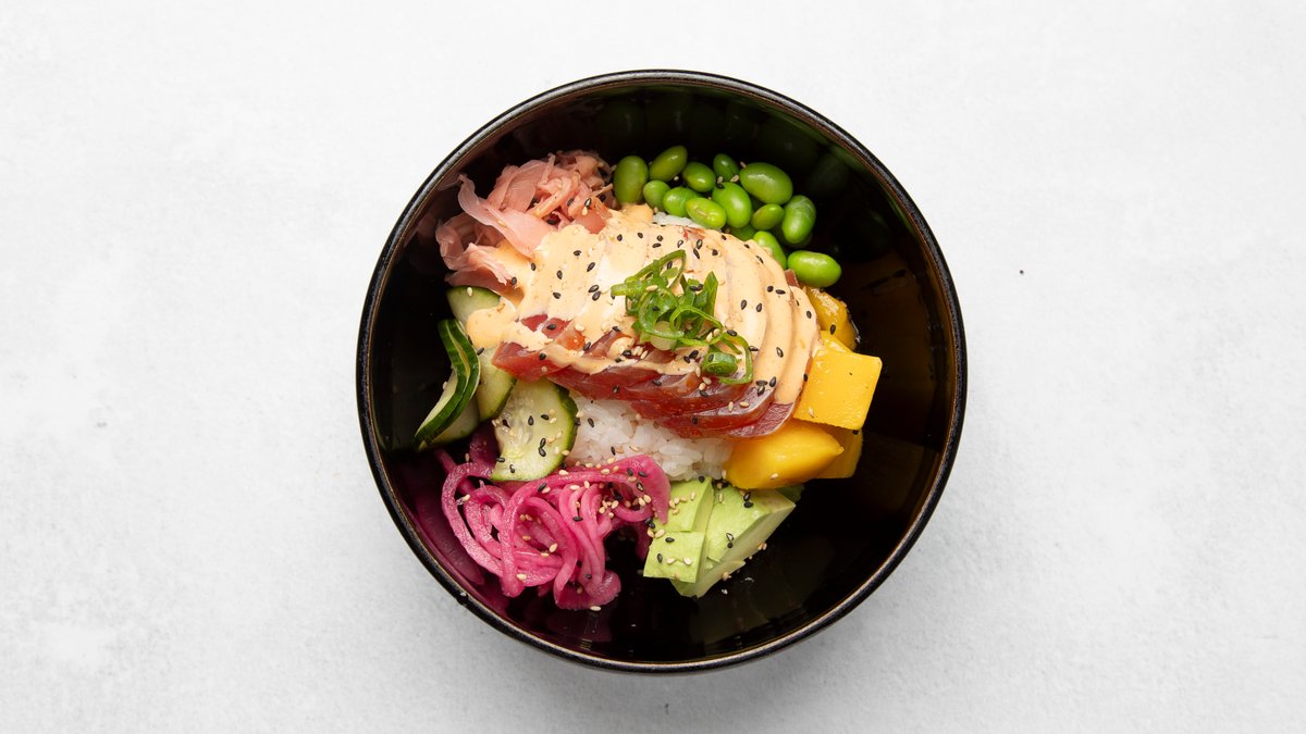 Lätt halstrade tonfiskfileer, avokado, picklad rödlök, edamamebönor, mango, sötmarinerad gurka, chilimayo, salladslök, sesamfrön och ris.