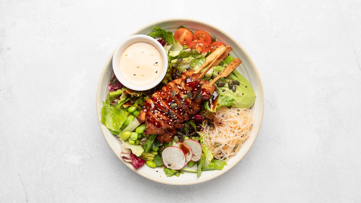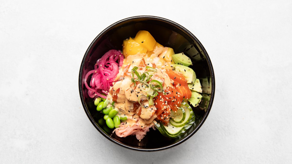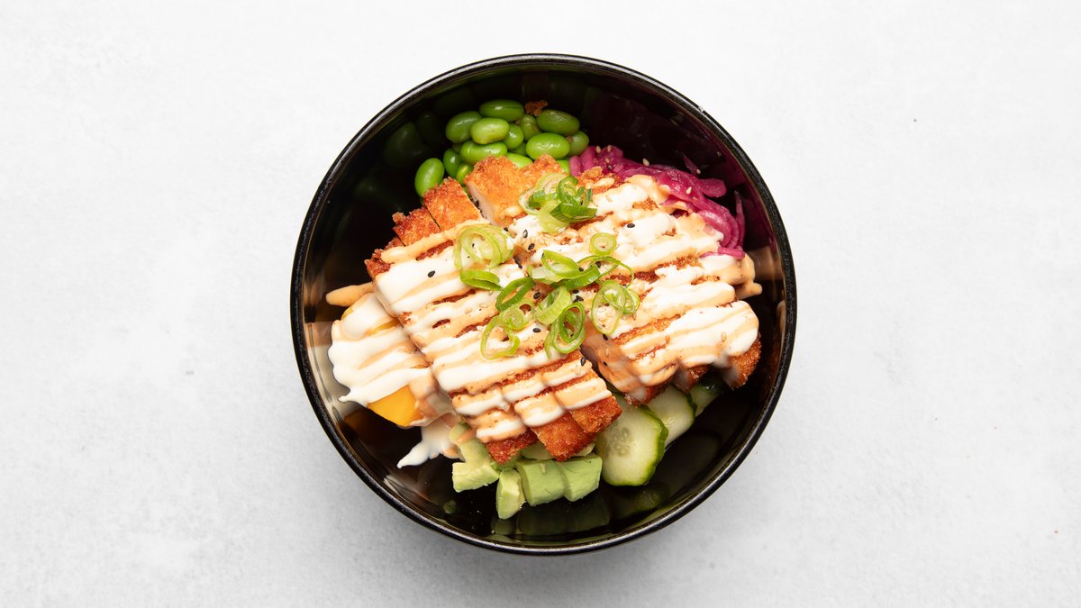 Friterad kyckling, avokado, picklad rödlök, edamamebönor, mango, sötmarinerad gurka, yuzu, sweet asian chilimayo, sesamfrön och ris.
