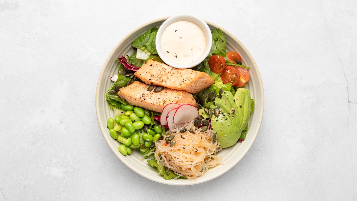 Blandsallad, cocktailtomater, sojabönor, marinerad glasnudlar, solrosfrön, pumpafrön och salladslök.