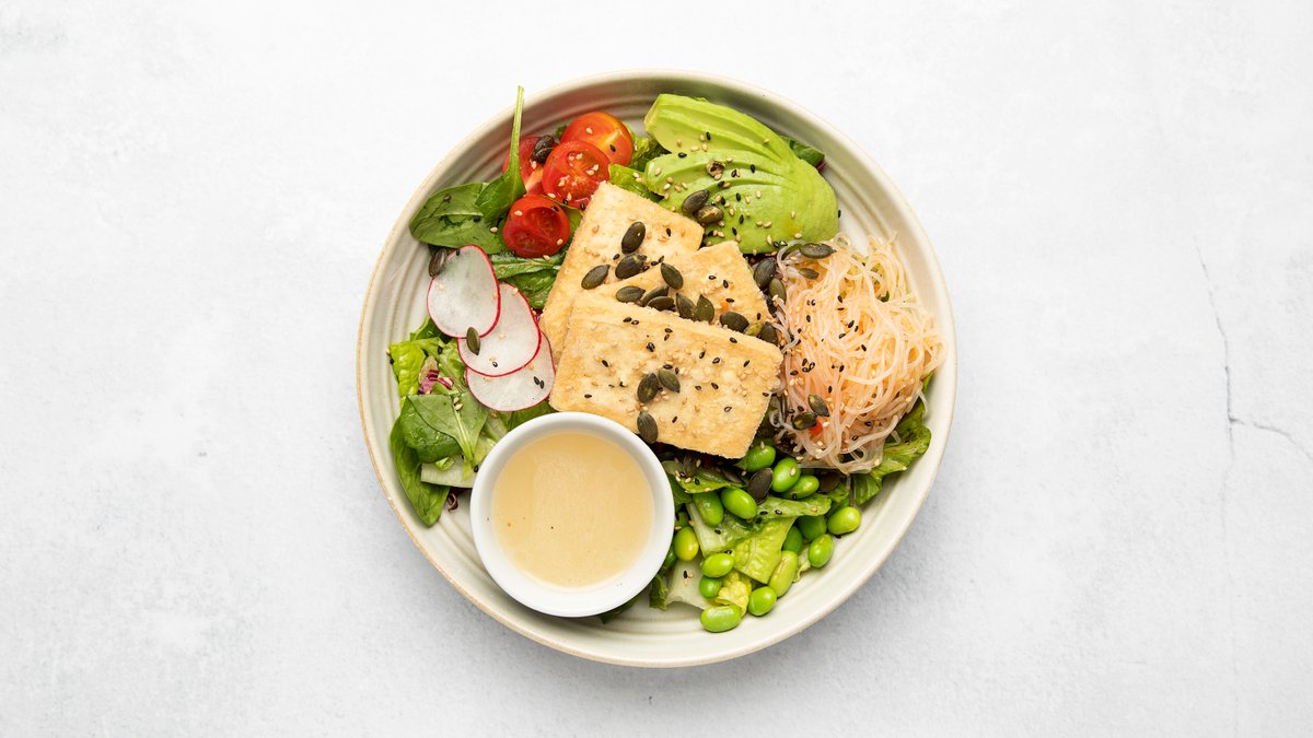 Friterad silkestofu, blandsallad, cocktailtomater, sojabönor, marinerad glasnudlar, solrosfrön, pumpafrön och salladslök.