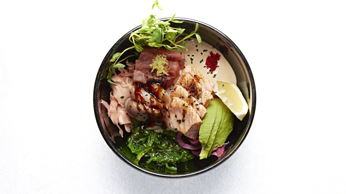 Marinerad lax i soja, sesam olja, ingefära, avokado,picklad rödlök, edamamebönor, mango, sötmarinerad gurka, chilimayo, salladslök, sesamfrön och ris.